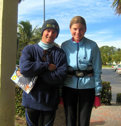Today was the coldest day of our winter season, 32 deg for the start. I heard the wind when I was getting ready for the run, so I smeared Vaseline on my cheeks, nose and chin. That would help with a cold breeze! I was dressed correctly and made sure that I had the thick real ski gloves on instead of anything thin. My hands have little resiliency to cold, once they get the chill, it’s only a shower that cures them and not much more. I also had to bring my own water, I guessed that maybe the county might shut off the beach fountains if they feared a freezing of their pipes. It never happened, but I had my small 35oz. belt Camelbak with warm water in it. Next time, I’d change and go with HOT water, ’cause it cooled off pretty quickly. I also brought two gels and a lip balm. All worked well, I only used one gel, we weren’t slated to run fast, so it was a novelty for me to eat that at 12mi. We were going to run straight up Jupiter Island, but my awareness of the NW wind from yesterday had me suggest that we do 2 laps of the inlet run, familiar roads, water & rest rooms the whole way – Charlotte agreed. I didn’t wanna be exposed to the wind in the beginning part of Jupiter Island. The first way to the inlet was cold and dark out. We made a habit of walking and drinking our fluids where the Sat water stops would normally be. I stopped in a bathroom at the pier early on to pee and clean my glasses. Char’s hands were cold very quickly, even with a liner glove and good ski mittens. She said they warmed some later. Mine fared better, my thumbs got cold so I tucked them in with the rest of my fingers til they warmed. Miles later – my hands got warm, then slightly clammy from sweat. I was happy they didn’t chill like Char’s, she was hurting.