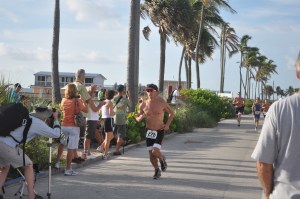 T1 was ok, I’d say average time in and out. The bike was a quick start and I never dropped off. I saw plenty of 23,24, 25 on Lap #1, some 23,24 on the second lap. I only drank during the four turnbacks. I don’t remember anyone passing me on the ride. I concentrated on even breathing, flat heels, using my right leg as much as the left, and staying tucked in an aero position as much as I could. I did well over the bridge coming back and had good speed even in the casino area prior to T2. The second transition saw me almost run out minus shoes! I grabbed for a water right in the beginning of the run but the volunteer pulled it away from me? Strange. I didn’t feel like I was doing a great 5k pace, and I had little opportunity to pass anyone in my age group. I assumed a pack must have broken away from me too far to catch. I saw two guys after the bridge leading back to the casino, passed one near the parking lot and the second guy I saw at the 180 degree turn. I wondered if shadowing him would work and blasting hard around the finish line or just passing him with authority on the hill curve and seeing if he could match me. I chose that. Closing on the finish line I saw Charlotte who told me I was being chased. The she said I wasn’t being chased, he had fallen back. Mt final time splits were as below…