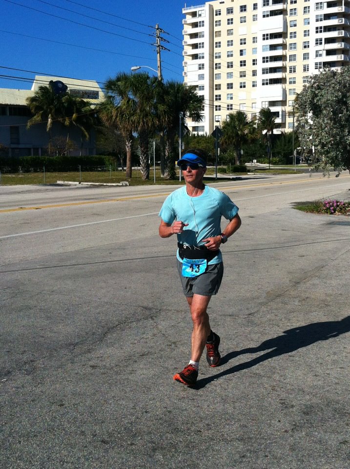 62 mi The thought of how hot is was supposed to be didn’t phase me, I know Florida is this way, and I was confident the heat wasn’t going to get me. I did the packet pickup Friday night with Suzanne, a quick in-and-out of the meeting then a dinner at a Zuccharelli’s restaurant in Ft Lauderdale. Walter was my ride down early Saturday morning to the 6am start for the 100k runners. I used the 7-11 bathroom, and had a belt with carbo-pro plus a carry bottle with drink mixture, I think they were using HEED. I started slow and incorporated walking a short bit whenever I wanted to sip liquid or just make a change to my stride. Walter went to a nearby LA Fitness for a workout and caught up with me maybe 1.5 hrs into the race, the sun was now up and I was near the 8 mile mark. I felt small beads of sweat starting on the back of my neck and in my hair. My feet which had given my some plantar stretching issues were fine, I was hoping that would still be the case in another 10 hours. I went to all rest stops, drank, refilled the carry bottle and mostly didn’t eat much. I felt the nutrition would come from the carbo-pro, which was partially accurate. As I’d learn later on, I really should have been chewing food along with the liquid calories. Walter met me at each stop. I spoke with other runners that said this year wasn’t as warm as last year, so times would be faster. I was a teeny bit ahead of my scheduled pace, one that would purposely have me get to halfway in 6 hours. My plan was to run a negative split all the way home to finish under 12 hours. It got warmer, I spoke with a few more runners, and at mile 17 I was caught by the drawbridge just after hitting the rest stop at somebody’s house. I saw Michelle Matys, last year’s female winner, leaving the house aid station as I was arriving. It was the #2 bib that clued me in to that! Once over the bridge I was in an area with little road shoulder and few sidewalks. I tried to hide in the shade from the sun as much as I could, I could feel the tanning starting to warm the right side of my arms. The lululemon shirt I wore had no SPF rating, it was supposed to just keep the sweat off my arms and back and in the air to dissipate. And make me easy to spot in light bright blue! I worked towards getting further north, Deerfield Beach, the long, open and exposed to the sun portions of A1A that go through Boca, then up into Delray Beach where they had nice rest areas and people at the beach to look at. Boston’s is back from their renovation, so they were crowded with traffic and pedestrians. By the time I got there, it was close to the beginning of lunchtime, but still I had to go through Boynton Beach. Once at the halfway point I met up with Walter and Suzanne. They had new things for me, but all I wanted to change was one sock on the left foot, something was tight in there so I used a thinner sock just on that side to accomodate that issue. Now I had Suzanne following me down A1A meeting me at the rest stops, Walter left for home. Soon Carolyn and Ed, then Teresa also joined in the caravan, meeting me as I headed south. I was running with a Canadian guy back and forth, he has Vibram toes shoes on and carried an open metal water bottle as all of his gear. we exchanged places til we got to the house water stop where I decided I had to finish ahead of him,. he looked so unprepared to go fast – I didn’t wanna see myself with him and make that correlation… I found that around mile 38-40 I was bloated, meaning I felt I needed to do a giant burp. I guess all drinking with no foodstuff was leaving my stomach in tangles. One guy at an aid station called it “gator gut.” Ed and Carolyn arranged to get bread, I started eating things at the rest stops, but no relief in the 40s (miles) I then felt as if I was so fat, I didn’t want to drink. This was a problem, I knew I couldn’t make it another 20 miles with no liquids, so I kept forcing myself to eat. My following group took pictures, sent txt messages to others, it was neat to have these friends support me in this way, when I saw other runners that just visited the aid stations, spoke to nobody, and kept heading down the road. With 10 miles left, I was now on familiar territory – the A1A run course heading back home. I passed a few people, got passed by some of the relay runners, and kept plugging towards home. The last two stops had me very tired, but my stomach was feeling better, so I ran better. I used my music from the 52 mile point in hopes it would give me good motivation to move quicker than walking. I thought that occasional 5 mile gap between stops was long, one may have even been 7 miles. Once at the last stop, I knew it was just the beachfront 5k to home base. I ran in my lane, kept an eye on the markers I knew from A1A marathon, like Sunrise Blvd and the condos and hotels. A guy with a green mohawk came up on me and passed, I decided to pace off him for the final 1.5 miles. He picked up the pace but I stayed close, then he dropped into a more comfortable stride. Once within a mile he sped up again. He had friends in civilian clothes running with him and filming him on a phone. We ran strong together for the last mile, but I didn’t want to leap into a sprint at the very end. I knew I was tired and glad my stomach was righting itself, the pace I had coming into the final stretch was great. The other runner made a dash for the line when the street became very crowded with Spring Break people and buses. I kept a good pace but never gave chase in the final 300meters. I finished in 12 hours and 49 minutes. I went straight into the ocean to cool off, something I thought about since running back through Delray, Deerfield and the other communities that had me within eyeshot of the surf. Suzanne thankfully did the driving on the way home, only after I spent a few minutes on the massage table helping the kinks and mini cramps out of my legs. The masseuse said because I stopped and