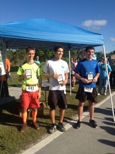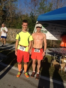 When we started running, my feet were kicked by a guy behind me in the first 1/3 of a mile. When I looked back, he said, “Run your line, don’t cut me off.” I replied with a terse, “Stop yourself!” I thought we were scrambling to get out of the way of the many kids that started up front. Now I was determined to not let whomever this guy was in the brightly colored shirt pass me. I didn’t know the course but figured unless he was really quick (unlikely that I wouldn’t identify him as a local runner) he wouldn’t catch me unless I broke. With John somewhere on the course behind me and now this guy trailing too, no way was that happening! I followed but lost sight of the three male leaders, John Reback, Ed Turrentine and Mark Cudak. One girl was ahead of me, didn’t know who it was but made a hunch that it wasn’t Ashley Reback, I know she is much taller than I am. Making mile post #1, I didn’t check my time, I just kept glancing at my pace on the Garmin. I saw plenty of 6:0… something and a few 6:20s. The trees make things difficult for the Garmin, as do the “out west” terrain trails. Who knew how accurate the Garmin would be? My driving thought was to keep going at this speed and control my breathing. My legs would be less likely to pucker out, because as I neared the halfway point (not marked on the course) they felt good. I thought the 2 mile post should have rolled along sooner, it seemed long. Once I knew I had only a mile left at almost a 6 min pace, I felt better, but now my breath was laboring. I got a cup half full of water at the aid stop, after a girl held one out, retracted her hand at the last minute and got a blouse full of water as a result. Once I made it on to the street, I knew there was less than 1/2 mile to go. It was work now, breathing and keeping myself focused on not giving in to the “just walk for a few seconds” urge. I came past the flour-poured start line, up the small rise to the bridge and finished fourth, 19 seconds out of third place overall, but with a win in the Master’s division. That’s great, because with that came a $100 gift card at Fit2Run!