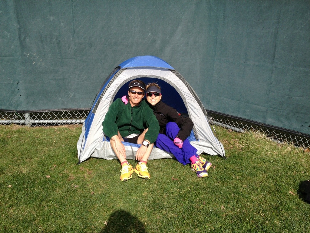 pup tent setup at home plate on the middle school softball field, that made for a good photo. We began the 3/4 mi walk to the start line with thousands of other runners. Time went so quickly waiting in the athlete village. We didn’t get to the start corrals with any extra time, a quick picture of the two of us as taken by a volunteer and we split into the corrals we were assigned.