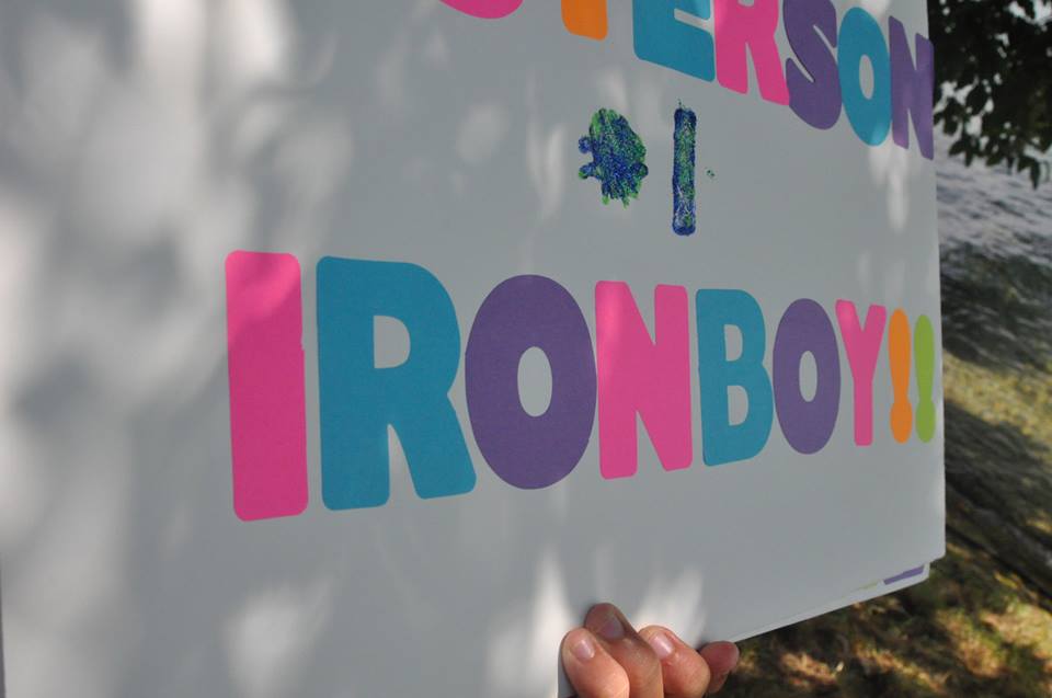I noticed this only as I approached transition to see how long I’d been riding. Scrolling through the CatEye features, Max Speed went by and said “50.0 mph.” I don’t get to do that often anywhere in Florida! Coming back around the lake, my speed was good, maybe 19-21 mph. A second pass by transition showed no fans but people out running their marathons in the heat. The run course had shade, but some long stretches othat were exposed to the sun areas, too. Now to pass transition again for the last time before I get to hop off and finally run. I passed that milestone at around 100 mi., then went for the second HeartBreak Hill climb. Not as many spectators in the dead middle of the afternoon, the music and announcer were still on duty, and it was easier knowing it was relatively shorter than The Beast. Down the hill, past Lindt Chocolate again and I was heading to transition. Sal, John and Mia greeted my arrival with a sign they held up for me. I figured they had secretly made it at the house when we were at registration or something. I discovered after the race that Suzanne McCarthy made one for each of us and sent them across with John in his luggage!