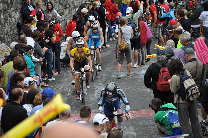 The race crew, volunteers, thousands of fans, the other riders, everyone played well together. Someone has to have taken great pictures of the views and sights on our completely clear day for riding the hills of Switzerland. If I can poach some from the web or Flickr I’ll include them here. - The weather. A week before the race (And three days into the “10 day forecast” range) the outlook for IM Switzerland was 78 deg high temp, 59 deg low temp and maybe the water would be low 70s. My tracking of the water temp at Mythenqaui (Swim start area) showed a dramatic climb in a matter of days from high 60s water to “wetsuit prohibited” temps right as we were boarding our flights in Miami to come here. I borrowed a full sleeve wetsuit to be ready for the cooler water, even a 72-74 deg temp on my “whimpy” Florida swim body could chill me over the 2.4 mile distance. All for naught – the race was rumored to be too warm for any wetsuits on Thursday. On Friday night we received a comfirmation of this via email from the IM Switzerland race team. Banned. Ok, not my ideal situation, because swimming in the TYR Hurricane wetsuit I had brought would be like cheating , I felt I could move much faster than I could muster on my own when I swam in that gear. Add a fresh water swim and the crowd funnel start area (See swimming section below), and you’ll understand why this weather change to Europe being covered in a heat wave was step one in the addition of time to my race day total.Let’s be honest, besides pretty blondes, who correlates anything “hot” with Switzerland? It’s a nordic country with winter sports at its heart. (Oh, and chocolate!)