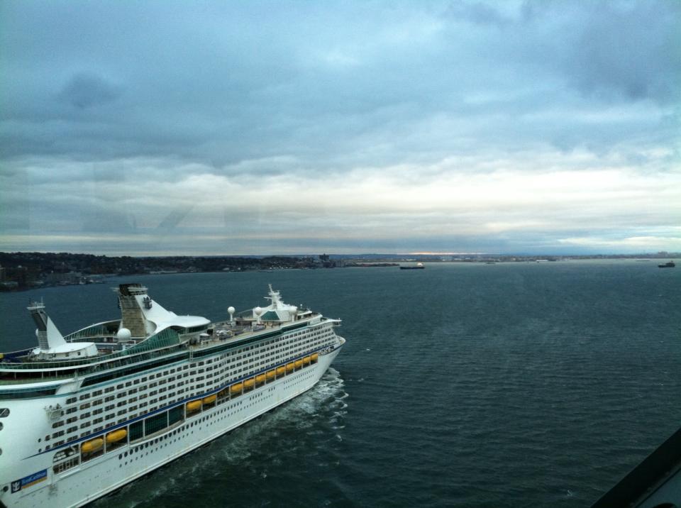 I walked home to my place for a good night’s sleep. Pre-race setup, what to wear, listening to the FSU-Miami football game, I was doing well. I went to bed early, but didn’t fall asleep. I wasn’t nervous about the race, didn’t think I’d oversleep nor had I drank any caffeine that day. I did sleep soundly and woke up before the alarm. Stories and reports of temps in the 30s kind of evaporated as my iPhone displayed a current temp of 52 at 4am. Going down to 46 by 8am, when we’d likely hit Staten Island for the Athlete Village waiting process. I dressed well, long North Face legs, compression socks, I moved my arch inserts to the Meb Speed shoes, that went well. I have good throw-away gear, gloves, a hat, I was ready for a cold wait outside the start. Sal’s charity team had a special bus to the start that we were able to ride, and best yet, a shielded tent in Athlete Village with food and drinks! Our bus ride went all over Manhattan finally crossing under the river at the Brooklyn Battery Tunnel. BQE to Verrazano Bridge, where we waited for 30 minutes to get across. It was great to be in a heated bus seat with a bathroom on board vs the Staten Island ferry ordeal. While waiting on the bridge, the Royal Carribean Explorer of the Seas passed under the bridge – that made for a nice good morning sight and picture!