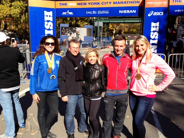 Once I heard Sal and Suzanne had finished, I decided to loosen up my legs and walk to their hotel. Cammie hadn’t checked in yet as finished, but they planned on having a great dinner with us at an Iron-Chef restaurant called Esca. I met Cammie and Jeff at the NYPD runner’s after party (Uh huh, another VIP drop-in!) and we waited for Sal and Suzanne to shower before I went to the room and did the same. I was thankful I thought to stash clothes in their apartment so I could change after the race. Our dinner was very good, I was glad Sal could translate the menu to me – Cammie said much of the same. If it wasn’t explained for us, we threatened to order the PB&J or meatballs on a plate! After dinner, everyone took a cab back to their hotel. I walked back to my apartment and got things organized for an early morning check-out. I connected with Hillary Hamer, referred to me by fellow pacer Andrea in Ft Lauderdale. I was supposed to meet with her some time on the weekend according to Andrea, but repeated texts found us in different places throughout the expo and race days. She had run her PR today in her first-ever visit to the city! I should have arranged to meet her after Sunday’s dinner. Her hotel was very close to our restaurant and without knowing it, we both walked home alone to our respective buildings. We planned to meet up in the morning for breakfast and a visit to the Finisher’s Merchandise tent in Central Park. I cleaned up the room, organized what I wanted to pack, wear and throw away and then tipped over on the bed. Lights out, Dave.