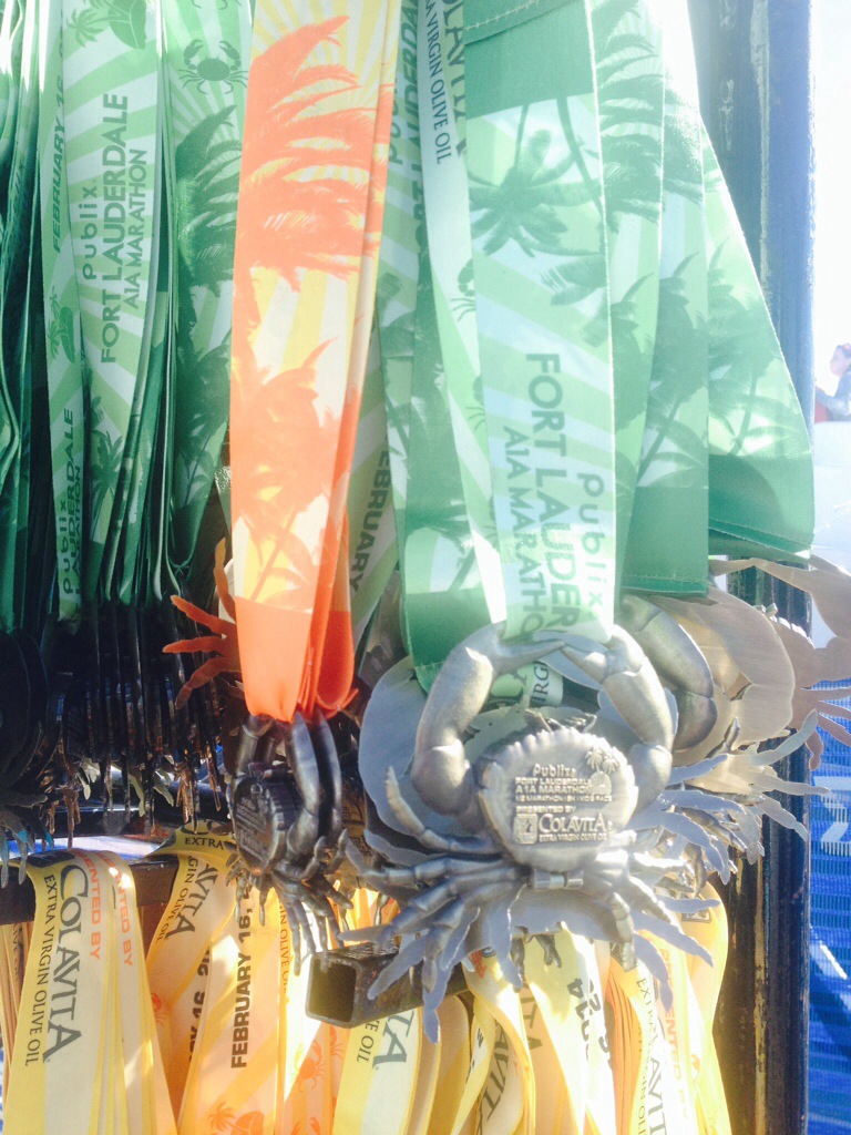 The last 7 miles were good work. Running the mid 7s pace was ok, my legs were getting heavier and my hips were creaky. I stretched my arms around as if doing freestyle swim stroke, that keeps things rolling forward better. I drank at every stop, I saw less and less people in front of me. Once near the half marathon turnaround, now there would be half marathon walkers on the course. I kept going well, passing a few other full marathoners before I got to the final “sunny” 5k This part of the course is good, I know it well. I keep near pace even as I see some 7:40 readings sneaking in. I haven’t checked my overall time against the pace band since mile 16. I am doing good, I have to keep it going. In a message early this morning from fellow pacer Kristen, she said I was athletically ready for a big achievement. With this kind of encouragement and belief coming from someone that doesn’t even train with me, I figure I cannot report back with anything but good news. That keeps me working hard and smart. I’m always looking to run the tangents of the road. I’m getting water at each offering and passing half and (the rare) full marathoners I see. This will be good because at 24 miles, I am in control of everything. I won’t sprint home, but I will be finished very soon! I make the 25 mile mark at the Westin pedestrian bridge. It’s tough, but I’m not cramping even as I feel my pace slow. I see 7:50s, mixed with 7:17 as I glance down. There is now less than a mile to go with the Publix banners calling out every quarter mile. Finally I reach the beach parking lot and leave A1A. Now just two laps around a high school track – the 26th mile is done. I see Sara from work calling my name on the right side. I am alone in the finish chute with several meters to go. The race clock reads 3:18 something, I was near 2 minutes off that all day, I’ll finish good! I cross the line but don’t shut off the Garmin until I’ve made it. I look and see 3:16:01. Whoa – I really did it well today! Officially my finish was 3:16:03, a big day. I made some magic in the last ten miles, almost matching my first half split time to the second. In pacing, it’s tough to be within the 30 seconds on the right side of your goal. I couldn’t have engineered down to the step finishing this close to perfect pacing at any distance!