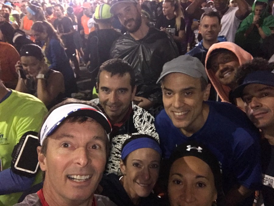 I met people in Corral E waiting for me from the Expo. I had 4 or 5 half marathoners, among them a friend named Jodi. Also, I had a few blue-bibbed full marathoners. Nicole, Jorge from Mexica, Leonardo, Maddy and a gal from NY dressed in all black. A few others stayed on the periphery, not talking or introducing themselves but definitely running with us. I went over the things I cover pre-race with my group: pace strategy, water stops, bathroom breaks, shoe lace tying and tidbits about the course. Some asked about the weather, I relayed what I knew… It would be cooler at the finish and we had an 80% chance of rain at 8:00 am. The race started on time and we didn’t have a prohibitive crowd running the first mile up the causeway hill. Staggering the start of the corrals has proven to be a good idea!