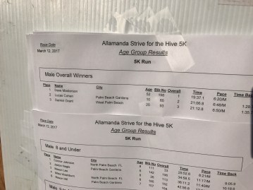 I met Deborah Feinsinger in February. She is a teacher at Allamanda Elementary School, and director of the Strive for the Hive annual 5k at the Gardens Mall. She offered a discount to any runners that wanted to do both races, Shamrock on Saturday and Strive 5k Sunday. In setting this up with her and our club, I decided to run the Strive 5k Sunday morning.