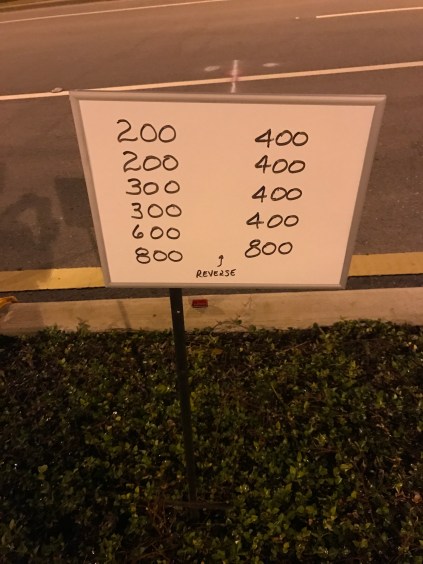 5mi It was 66 degrees out and after last week’s short rest in between intervals, I did pushups and burpees to hopefully wake up my lungs for the track workout. Paul brought his new sign and re-marked the course at every 100m for us. I ran with Janet who was ticking along very well for the intervals she could stay for. She only missed 3 400s at the end.