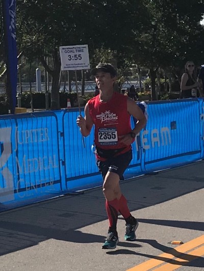 On the other side of the bridge, our run club staffed the wacky water station. Named “Winter in Florida,” it poked fun at stereotypical touristy garb and people who overdress in 69-degree weather. We were on pace as a group, easily zipping over the second and final small hill/bridge on the course. My group was good at the slightly below 9 min pace, I explained that if they went with me to the 12.8-mile mark, they would be trusted with a quarter mile on their own to finish. If they could keep the pace alone for a loop around a high school track, they’d beat 2 hours for their race.