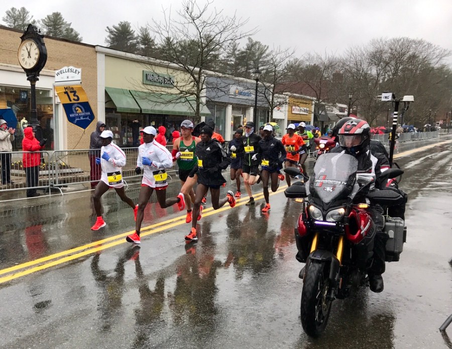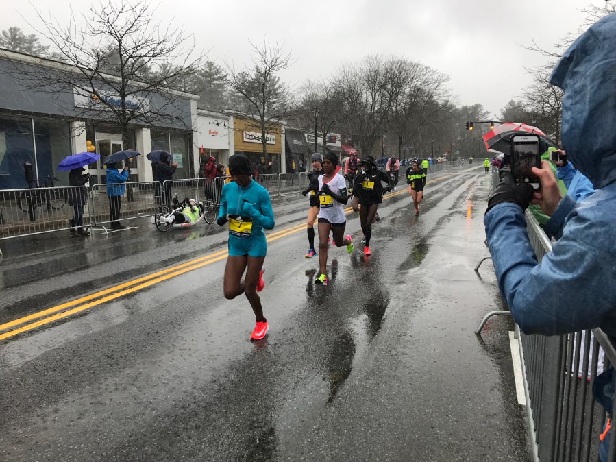 It was really wet and windy on Rte 135. We ducked into Peet’s Coffee to figure out how to wait for the first wheelchair racers AND stay dry. We ended up walking west and settling under a covered awning, still exposed to the cols and spray of rain. An umbrella wouldn’t have worked for today’s weather. We found a real estate office that planned on setting up a popcorn machine and bottled water station outside for locals and fans. They ended up putting their giveaways indoors, which gave us a place to track runners on the BAA app out of the weather. Then we could pop outside to the barriers and cheer for the racers. They eventually put the live telecast on a conference room TV, so we could follow the media coverage of the race, too. Phone charging, clean restrooms, and a warm place was very appreciated!