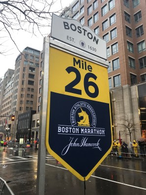 We went to some of the restaurants and bars on Boylston to finish the night. There were definitely less people around and out due to the lousy weather. Most runners were home still figuring how to warm up or piece together what they had just completed. Our bartender claimed to be a “track runner.” Maybe the Nike/NB outfit was a costume for more tips or perhaps she was working her way through track season. Anything’s possible on Boylston St. That was very evident today. It was a wild day to race a marathon.