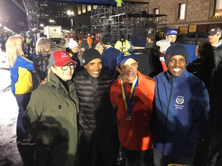 Next was a visit to a private party for the elite finishers that we were not let into. We met Cami and Jeff for their post-race debrief. She was fine, better than most finishers! After that, we went to see Dave McGillivary finish his 46th consecutive Boston Marathon. Meb and his brother were also there to meet him – he is everywhere on race weekend, plus he ran the marathon! Neat to see that at 10pm…