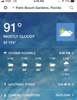 The Garmin wacked out on Mile #3. It started giving readouts of 5:10, 5:05, 4:50 pace. I wasn’t running faster and the course through PGA National was the same route I always use. It said my middle mile was a 6:20-something pace which skewed my average. I wasn’t picking up the pace or trying to run near that fast. I would think my average pace was below 7:27, but not the 7:16 the Garmin found using that fast 3rd mile. In my second mile, even with the heat, I felt good going a 7:14 pace. With 6 more weeks of training in the heat, I hope that is the norm in a month!