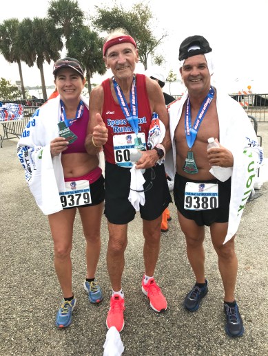 We had some good laughs at the two ”liquor bars” set up on residents driveways. Neither myself nor any of my runners opted for a tequila shot or Mimosa. I ran with the Australian gal and two or three others very close behind hanging on at mile eight. The South course does have curves and as long as we could run tangents without interfering with other oncoming runners, we did. I explained the benefits of this to my group. Once we got to mile 10, we were on target for the slightly below 1:45 finish. Now even the Australian lady began to fade back and I was catching up to Ed. He was in good shape and running strong, he wanted to beat a 1:46 time – so his goal was to finish ahead of me or at the very least right with me. He had good form and I encouraged him to stay with me until we had less than a mile left to go. The finish line was a bit further than the traditional older amphitheater site, so when we came down the final slope and onto the long straightaway leading into Cocoa Village, he sped up and ran ahead. I recognized a female runner in front of me, Nimia González. I ran up next to her and told her to hang on and run right with me. She was happy to see someone she knew from West Palm Beach! She said she was very tired. I explained how close we were within 1.5 miles to the finish and how she definitely was strong enough to stay with me. I also ran by an older gentleman with a red singlet and graying hair. I encouraged him to join us – he tried for about a quarter of a mile, then he fell off our eight-minute pace. As we went through Cocoa Village, Nimia and I recognized and waved at a few runners from our area that had already finished their half marathon on the North course. I think this distraction helped her because we were only one right turn away from the final straightaway and the park with the finish line. I saw Mike up ahead making his finish ahead of me – that’s a PR! Nimia sprinted ahead and also finished slightly ahead of me. She met me at the finish line along with her boyfriend to thank me for not allowing her to walk that last mile. I crossed in 1:44:33.