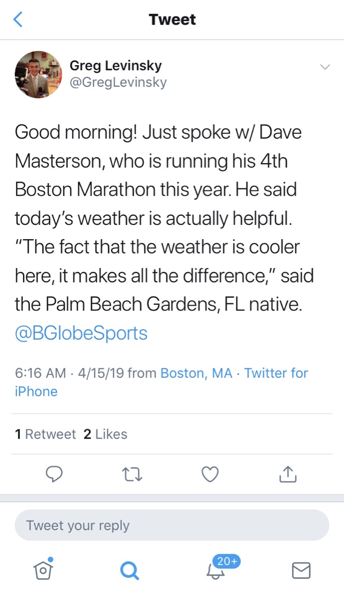 Julie went for a restroom break and she brought a bagel and peanut butter back for me to eat in the lobby area. In that short time she was away, I was approached by Greg Levinsky, sportswriter for the Boston Globe. He asked me a few questions about my thoughts on the race, where I was from, and how I thought I’d fare in the weather. He published this on his Twitter feed: