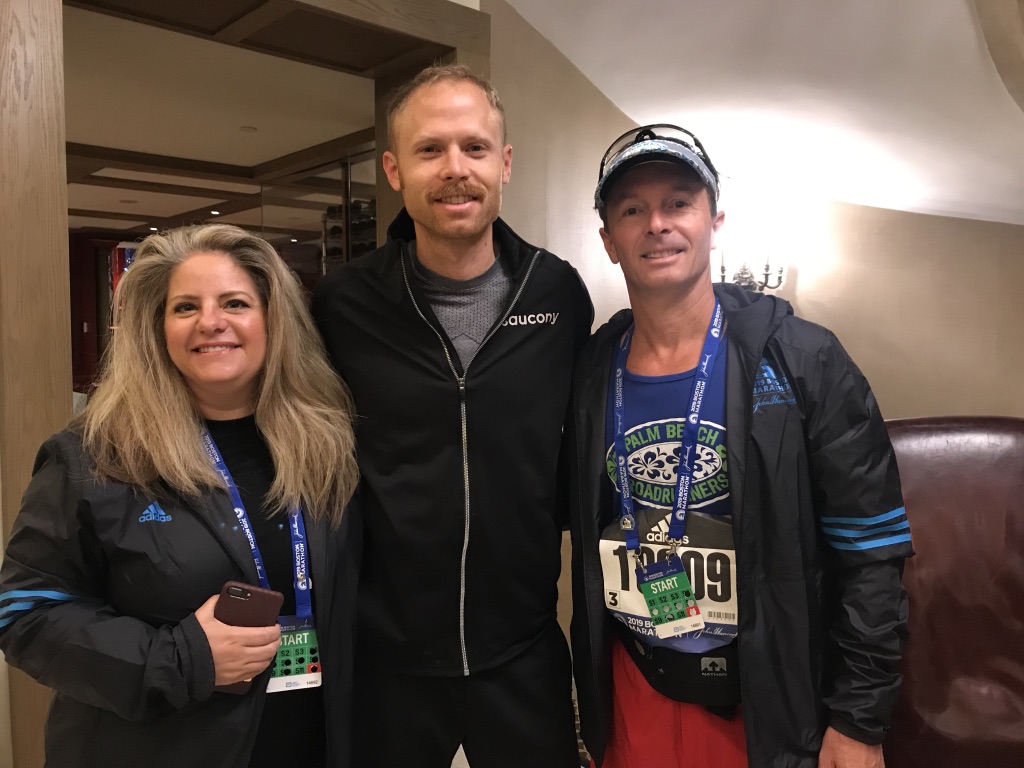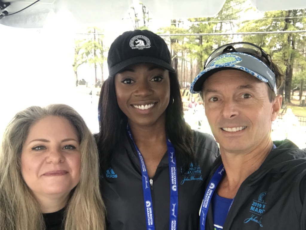 Race morning was an early wake up – Julie had secured to role of sign language presenter at the Start line. That meant meeting at the side of the Fairmont Copley Hotel before 6:15 am for a ride on the bus with the Start and Finish line support crew. We met Jared Ward, a top American elite. He was waiting for hotel staff to bring him a razor. He is well known for his mustache, but he wanted everything else his face on “smooth” for the big race. I jokingly said he was the best groomed of all male elites, this got a nice conversation started before we left the hotel. And a photo!
