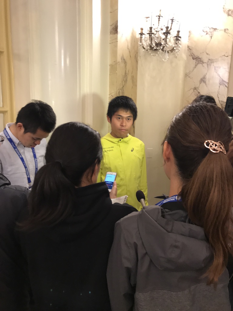 I found Julie first, she couldn’t maneuver through the security checkpoints, so I walked to the Fairmont Copley to meet her. Once there, I saw Yuki being interviewed by the Japanese media contingent. And I met Sara May Berman, the 1969, 1971, and 1972 Women’s Champion! I spoke with Joan Benoit Samuelson’s daughter as her mom did interviews after her 3:04 marathon. Very inspiring, she is 61 years old.