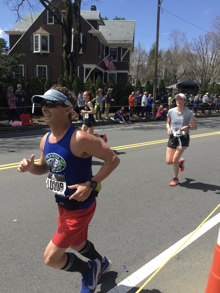 The sun popped out as I passed mile 16 and ran towards the highway overpass then the right turn in Newton. I remember thinking about how this turn at the firehouse is the beginning of problems for so many runners, pros and us regulars. I did good hill training and I knew how these would go. The first hill I went up nicely right at my pace. I took a gel and ran through the water stop cleanly. I saw others slowing or walking. For anyone that would have done their training in a cold wintery place, sun and temps in the high 60s would be disturbing. The next two hills are smaller, I kept putting my head down after picking a landmark and agreeing that I would run strong ’til I made it to the red banner, etc. Things stay flat a little before the final (Heartbreak) hill. I saw Chris and Tom right where they said they’d be, on the left side at the beginning of the climb. I ran by for a “high five” and Chris took a photo. To see people you know and get an encouraging word at an out-of-town race is an energy booster for me!