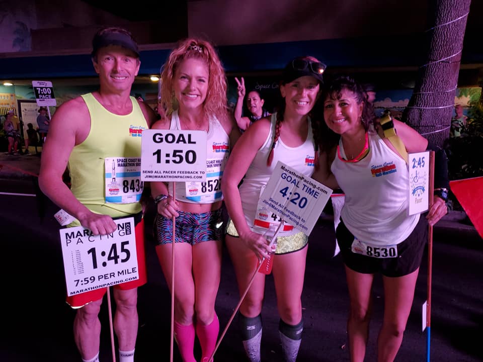 I started with a good group – most noteworthy was Johnny Pettygrue, Pacer Tia’s husband. He said he had just recently done a half marathon at 8:04 pace, so he’d be good going with me. Other notables were Nimia Gonzalez, a runner from my town that I helped her last year reach a new PR. A gal named Jessica from Orlando, Joe from Vero Beach (or Ft Pierce) area, Mike, an older gentleman with blue shirt and red shorts, and a woman named Kelly. My friend Maureen started with us but broke off at Mile 4 for the restroom. Only a few of the runners paid attention to me giving the basics of shoe lace tying and how to run through a water stop. At this pace, many must feel comfortable in their personal setup beforehand.