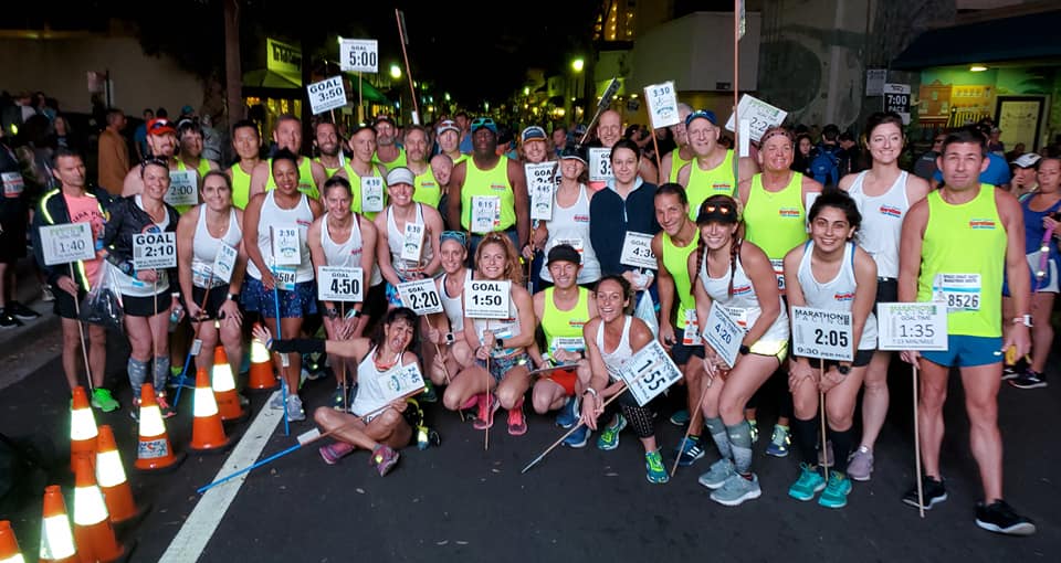 We ran as a group in the dark for the first 5 miles. I joked and reminded them of the “bar” on the course that serves mimosas and tequila. Approaching the turnaround, which is in a slightly different spot, we had 4 or five of us tightly packed at the pace. I saw a few of the others right as we started North again and I encouraged them to stay within sight of me and the 1:45 sign. Now we got to enjoy the cheering and encouragement of the folks coming down the course to their turnaround. We were at a good pace, maybe a few seconds slower than perfect as is usually the case with some slowing at the turnaround. Joe and Jessica were up front with me, Nimia fell slightly behind. I told the group that I had to finish on time, but if they felt good in the cool weather and wanted to go faster, they could. I recommended they wait until after Mile 10 when all they’d have left was a “familiar” 5k distance to cover.