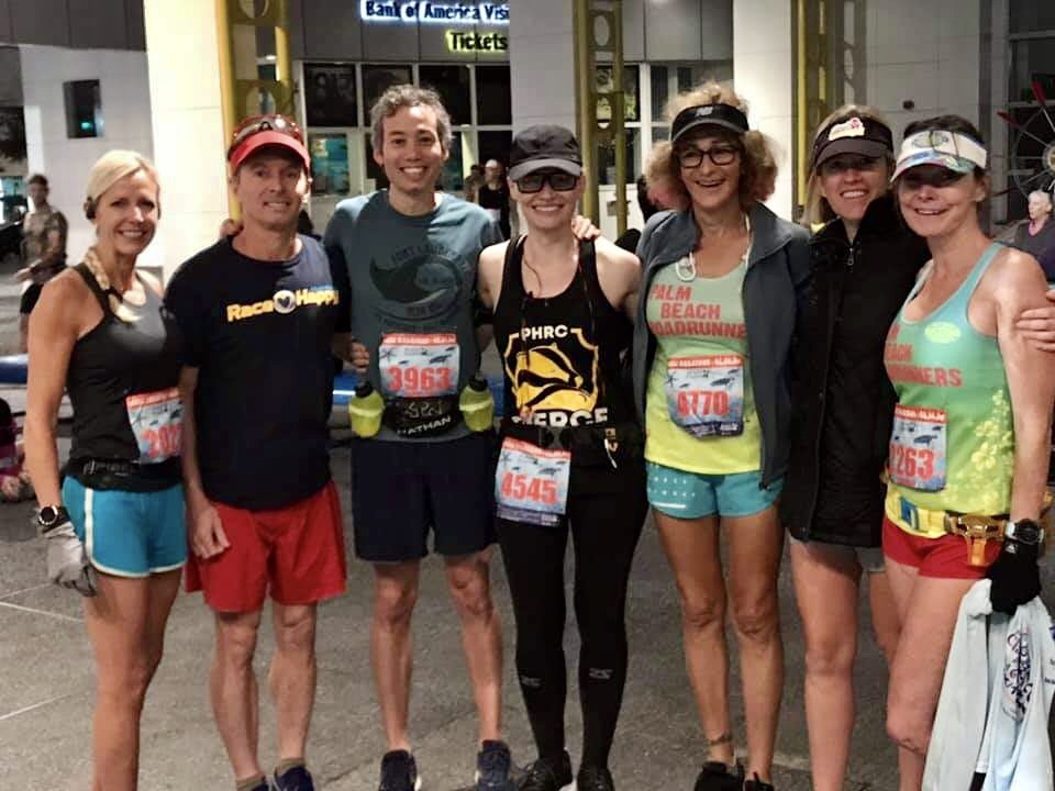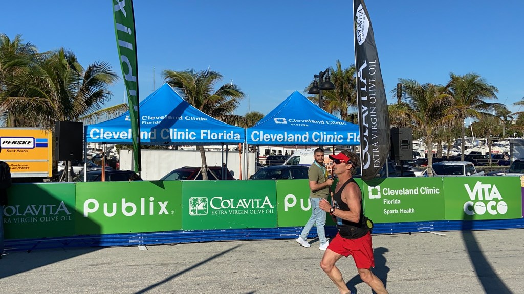 Running with Brenda was good, we ran the first mile in the most crowded section in 8:12. She was concerned about this, already 30+ seconds off perfect pace, I assured her that this is normal and a better way to begin a race. We settled into a pace between 7:37 and 7:42 – at that speed she was comfortable. My watch seemed to be delivering more accurate “on the mile” pace reports, so I announced each time what we were doing and gave positive encouragement as a result. Mile 2 and MIle 3 were in the dark on Las Olas Blvd. We kept our cadence up the hill of the Intracoastal bridge, and came down at a nice pace, too. On the way to the park we saw Ricky Montez at the Sunrise Blvd turn, it’s always good to get that mental rise from seeing fans you know! Once in the park I ate my first gel, that was easy. The Maurten gels don’t have much of a distinctive taste, and I can get one in my mouth and swallow the jelly-like contents without water. I chased it with the cold water from the next aid station located past Mile 5 in the back of the park. Once out of the park and on A1A again, I always look for the half marathon race leaders heading back. This time it was a guy running all alone. I later learned he finished in 1:11, considerably ahead of runner #2. I saw Rick and Erica, Cliff and Kaitlyn, Nikki and Alicia. Then it was split time, I encouraged Brenda and reminded her to take the “cleansing” deep exhale breaths to relax her shoulders. She thought that was a great tip – and after the race I asked her about it. She said she did a few with loud exhales, she wondered if those around her noticed.