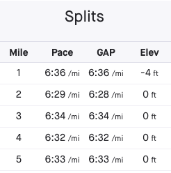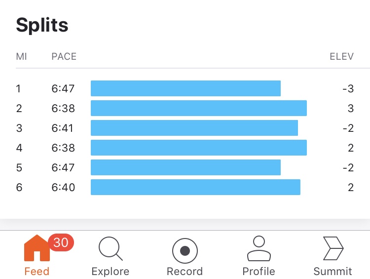 For this one I brought water only in the bottle. It was breezy from the SE, meaning a tailwind on the way down and a wind in the face finishing. I felt good on these miles, having a pace average of 6:42 for the 6 miles. See below…
