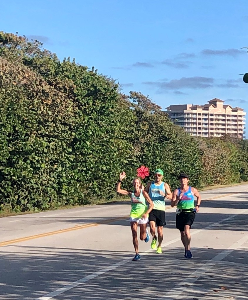 The final mile and a half had Kim saying, “Now I need you to work me so I don’t fade – I want to finish strong!” Maria and I slowly increased the pace, which from 8:30 was 8:10, then 8:00, then under that at 7:45 minutes per mile. We were in the sunny section near the parking lots north of Marcinski Rd, then the sun-exposed section between Marcinski Rd and the pier. We hopped onto the sidewalk a few times to avoid cars and bikes. The road was filling up with people looking to be out of their house on a nice weather day along the beach road. We kept going south, quicker with each passing 1/2 mile. Once we were less than a mile from the end, Kim mentioned she felt like her shoulders were dropping and her pace was slowing. It wasn’t. Maria ran behind and I ran next to her, both of us saw the same thing. She was using good form and pumping her arms as if doing a track interval. She was going to finish well and there was only less than 1/2 mile to go. At the Loggerhead Beach traffic signal, her husband Mark waited and took some photos. Past that, Chiara and her friends waited and cheered where I told them we would likely finish, near the thatched hut on the ocean side of the road. Maria and Kim’s GPS watches were a tenth of a mile ahead of mine, probably their route out of the Inlet park was longer than mine. We ran towards Donald Ross Rd at Kim’s opened-up pace for the final meters of the marathon distance. She and Maria stopped when their watch said 26.22 as we discussed, I went another driveway or two further until my watch read the same.