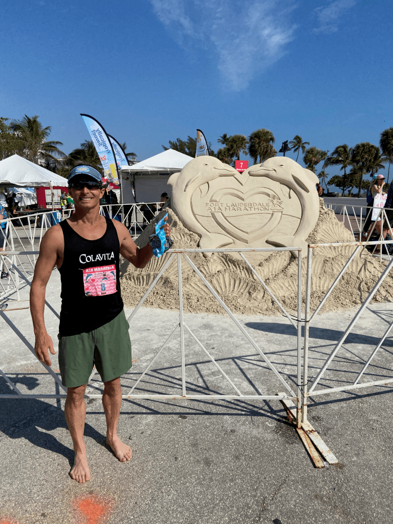 It was a slow finishing slog for me on the very popular Beach Place and Las Olas area. With less than a mile to go, I took a minute to realize that this was the warmest day for this race in all of its 16 years. The finish line chute area wasn’t crowded as it usually was. I saw the time on my watch zip past 3:59 and I saw how close the finish line was to me. I didn’t have to sprint, probably because I didn’t believe it would be that close. When I crossed the line and stopped my Garmin, my final time was 3:59:59.