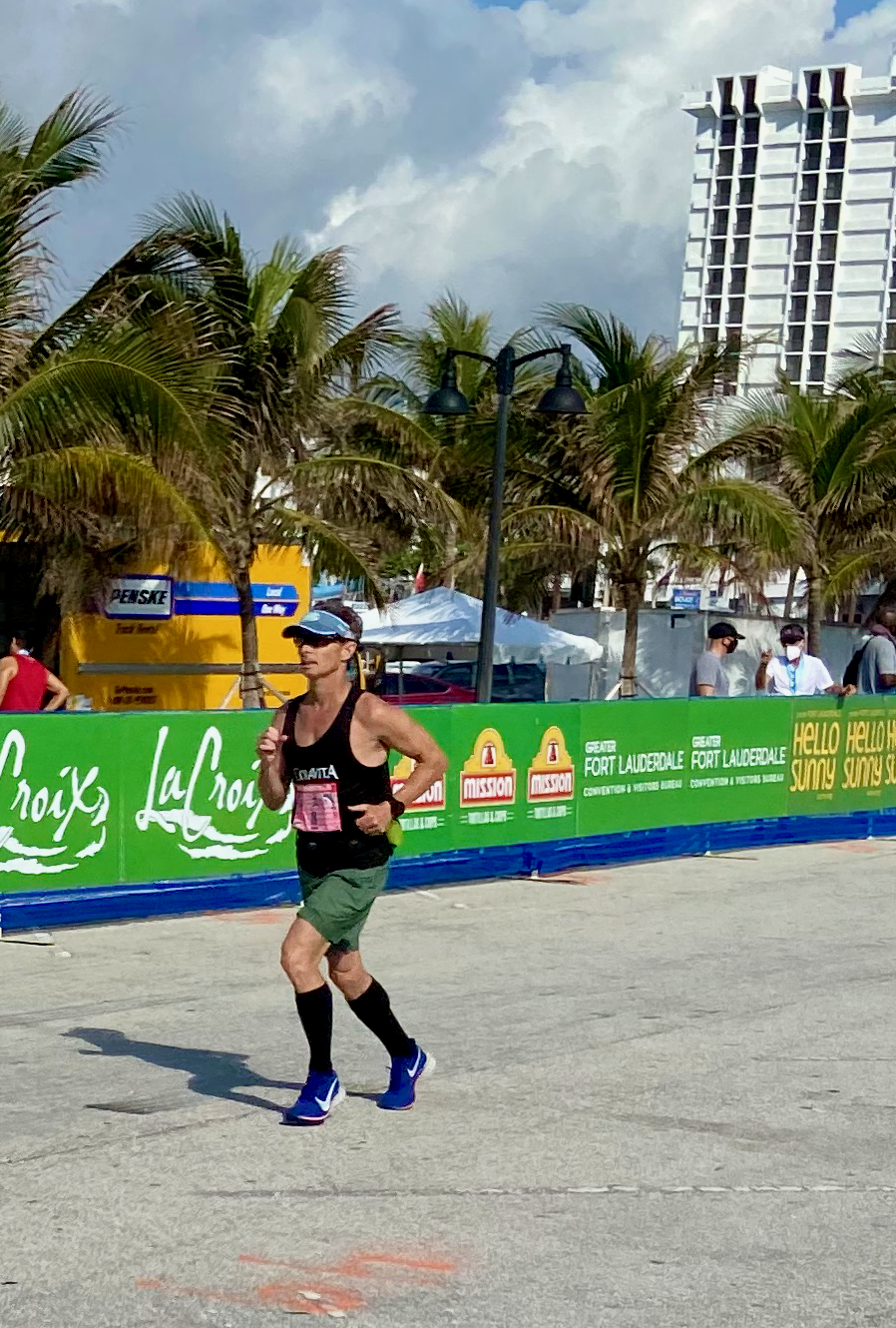 I ran on the familiar side street (Palm Ave) that leads to Lauderdale By the Sea and the Mulligans I suggested we should meet at once the event was over. My turnaround was almost at the end of that street, then it was running back south into a breeze for miles 10, 11 and 12. Before mile 12 I had already finished the disposable bottle I had carried with Maurten drink. I wanted to start using the bottle I had been carrying on my waist belt. I tried it and that drink was already warm, even having been frozen overnight. It did live outside the freezer for the hour long drive down, the hour plus wait to start, and the near hour and a half I had been running already. My stomach wasn’t happy with the fluid going in, or my attempts to use regular water from the aid station. Somewhere south of the Oakland Park Blvd condo buildings, I began having nauseous feelings. I purposely took some off of my pace, which wasn’t labored, but it didn’t help. Before the 13th mile I stopped on the sidewalk by the beach and heaved a few times, all without really having much of anything to send back up. That burning sensation of bile running up your throat and dripping out as I coughed… not good!