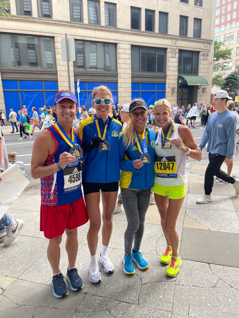 I found Patty Hanley and hew friends volunteering with the finisher’s medals. So neat to know someone that does this every year! Her usual spot was off this time, since the first set of volunteers had face masks instead of the usual water then medals. The weather had warmed but there was a breeze, I could see that getting the shiny mylar blanket would be a good idea. I left the finisher’s corral, got my bag of checked clothes and went to the Stuart & Berkeley Ave intersection. No Back Bay Center massages this time, that building was sealed up. I was at the beginning of the Family Meet Area, so I took off my shoes, spread out my things and started checking on the others that would be finishing soon. I didn’t have Ben Foster or Mark Dahlmeier’s phone numbers, so I relied on the app to figure out what others were doing. I saw them finish – first that Sandra had a new PR of 3:22 – a time that would give her a top ten age group finish for the day! Jen Castro was speeding up – running a 1:44 first half capped by a 1:40 finishing half! She credited that to her daughter texting her mid race. Jen could see the texts on her watch, Kaitlyn apparently told her mom to, “Pick up the pace!” Kim was expected in just under 3:30, her origianl goal time. She finished in 3:28:30 while also achieving a negative split for the day’s effort! Nicole defied her injury and didn’t walk the whole way to finish in just over 4 hours.