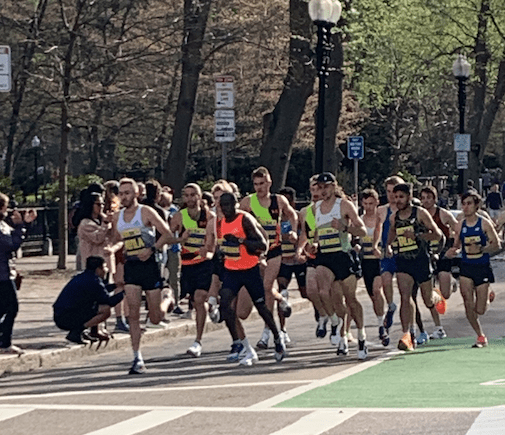 I saw the two Air Force planes fly over for the beginning of the Elite Men’s race. I lined up in my corral 7 for the first wave. I only had to stand around for less than 10 minutes until we were underway. A real big crowd of spectators, for a really excited group of runners. This was Boston back to normal!