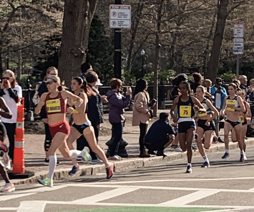 I am drifting off pace and losing enthusiasm fast. I know this is MUCH better weather than anything we had at home for training. My legs are really entering a slog phase, I am losing 10-15 seconds per mile. I realize I am not going to gallop faster on these legs for the remaining 11 or twelve miles. I am running in the “quiet” part of Wellesley, when you are next to the train track for the commuter rail service. That’s mile 14 to 15. Mile 15-16 feels better, it has a nice downhill so that makes my pace look better. I feel my legs more & more, I am discouraged knowing I will not be able to get back on the 6:50 pace. I’ve had a failure somewhere physically, and now my mood is crashing, too. I might as well walk through the water stops and get a drink, stretch my legs, etc. I’m not in the terrible distressed situation I was in October, but I’m not really excited about showing up for a substandard time – again. I won’t bust my ass to finish with a 3:15. I’m going to just run and eat when I want, walk through the aid stations, whatever.