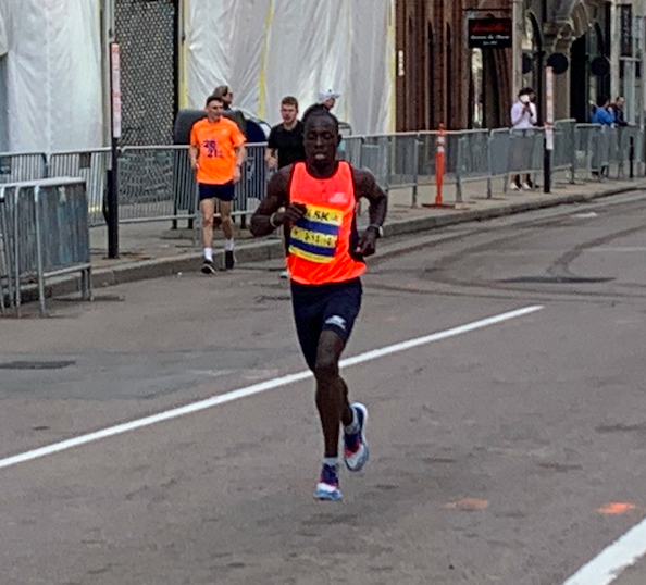 The large “Heartbreak is Over” inflatable sign is up again on Boston College grounds. Now I get to go downhill. Still my legs feel like I am finishing the race, not rambling to the 21 mile mark. I like seeing the BC kids with their red solo cups, all partying and cheering for us runners. I didn’t take a gel from the Mile 22 Maurten station, I ate one of mine and tried to stay on the correct side of the road for the tangents. It was windy now and I noticed the white bibs passing me. I knew that was coming, I’ve been that person before. I think to myself that if I finish in under 3:35, I will be that again, the second wave person catching the faltering red bibs late in the race. In Boston 2024.