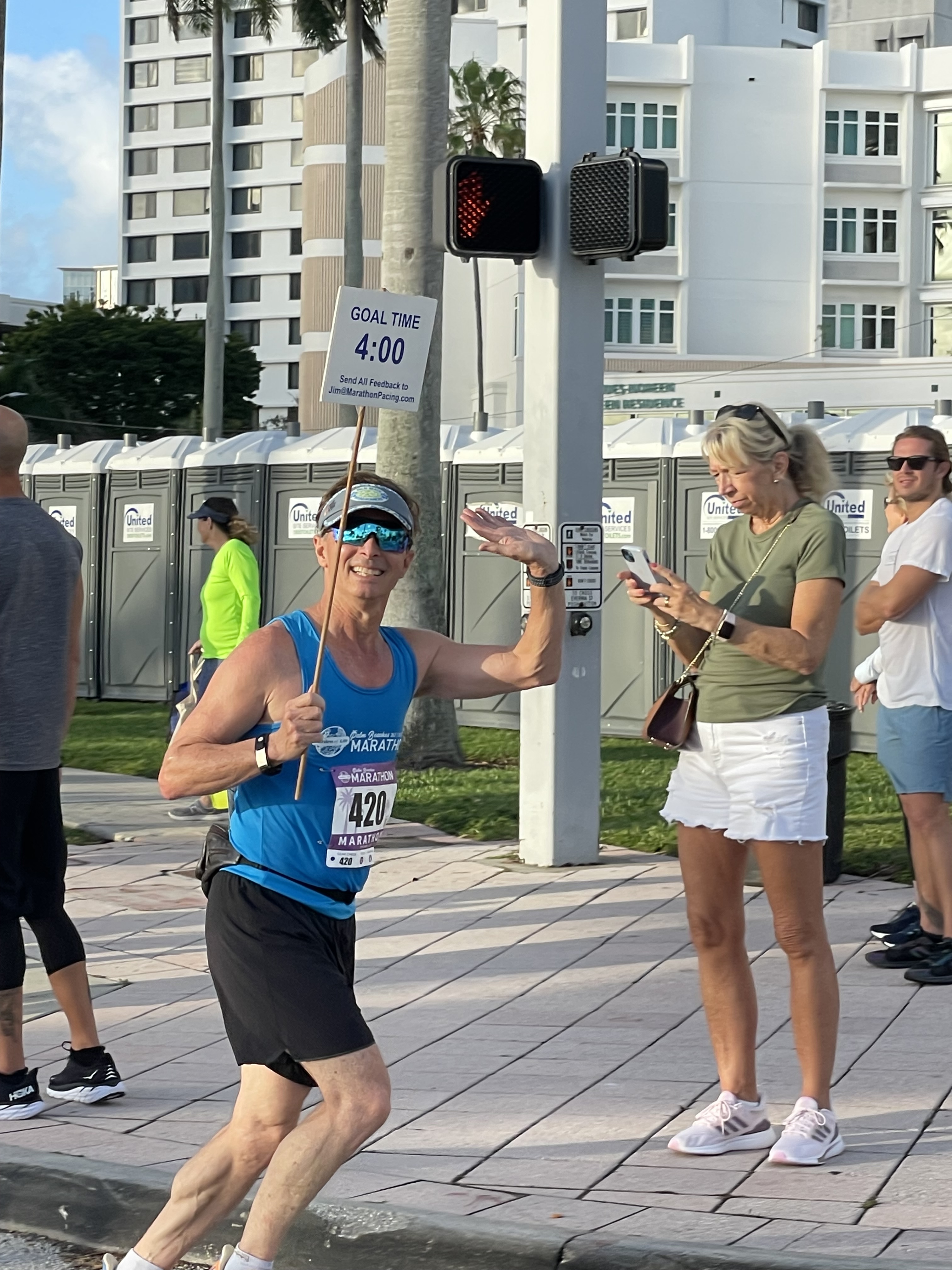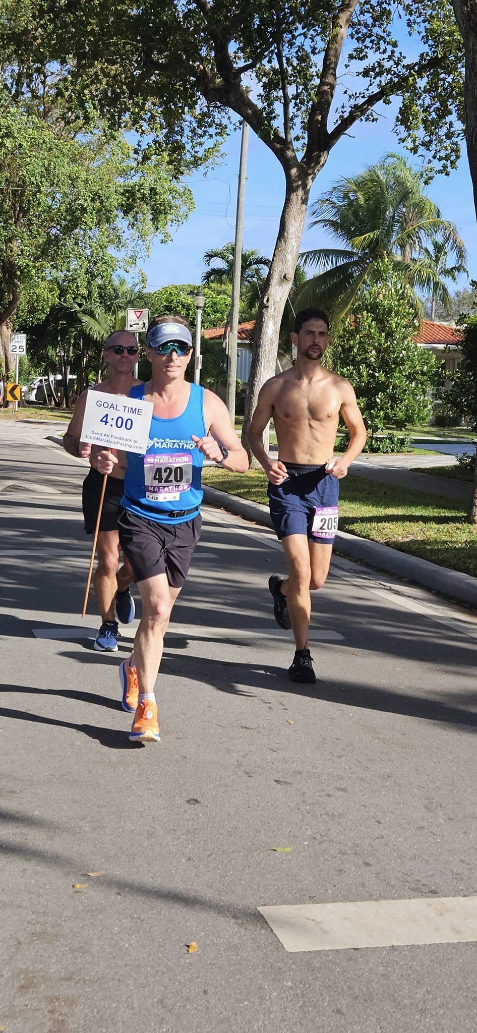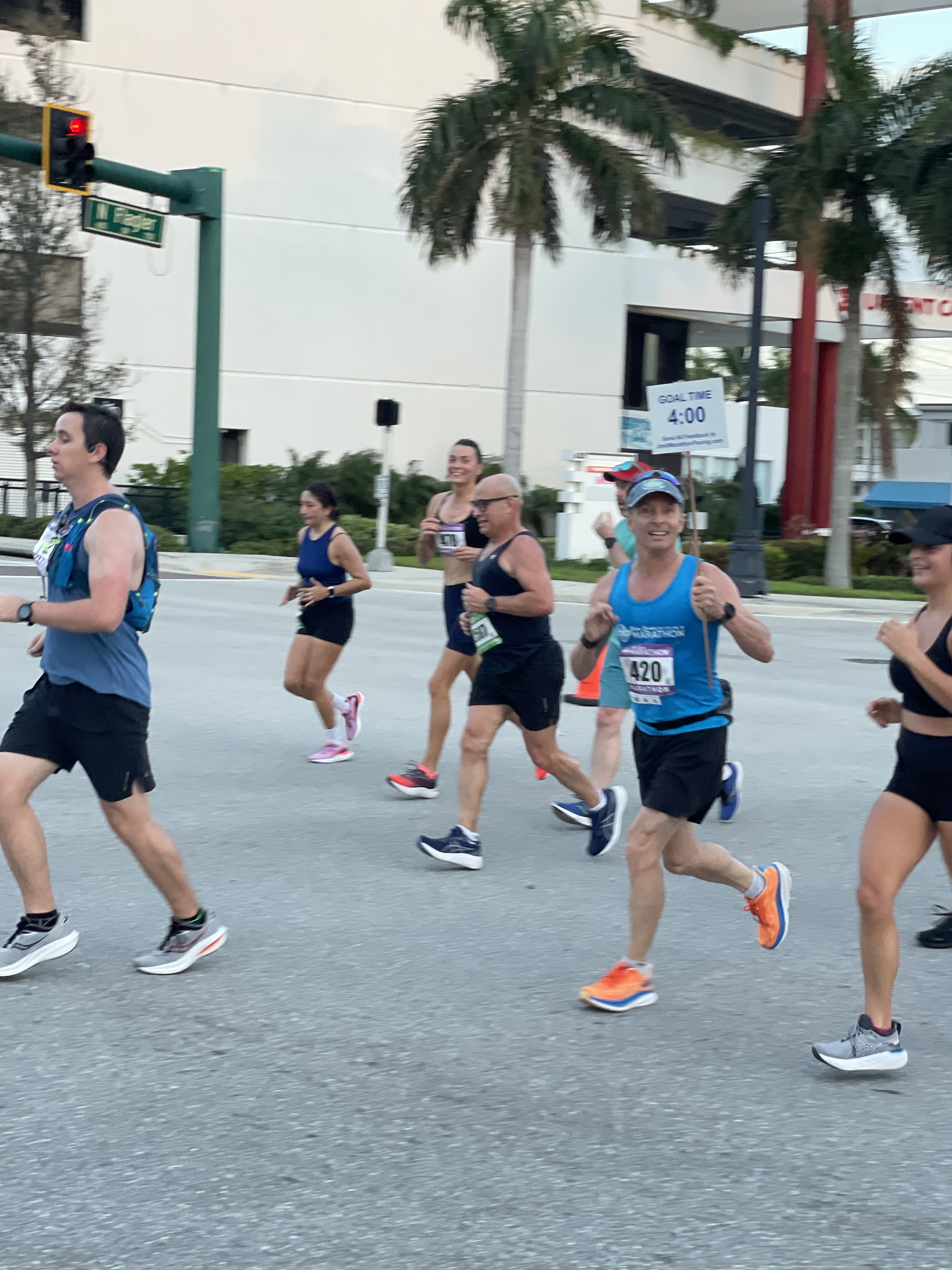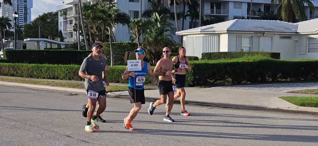 We ran south under the Okeechobee bridge and on the sun-exposed section of Flagler Drive. Winds were over 10 mph in our face which made holding the sign tricky. My group stayed together, a few halfers fell off, but for the full marathoners, my main tribe was set. Valentina from Davie, Chad (who’s son was in the marathon as a first timer), and Alan. We were on pace for the halfers, ducking off Flagler Drive and into the shady and shielded neighborhood by South Olive Ave. A trip down to the turnaround had us greet the other pacers heading adjacent to us and seeing more familiar people. The runners were impressed with how many people cheered for us and knew me. I told them they’d likely get a similar response on their “home course.”