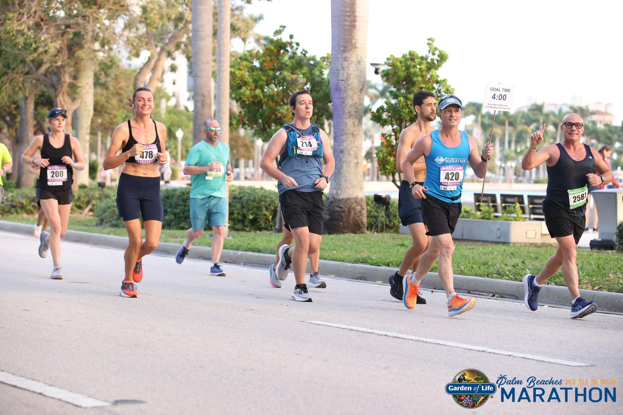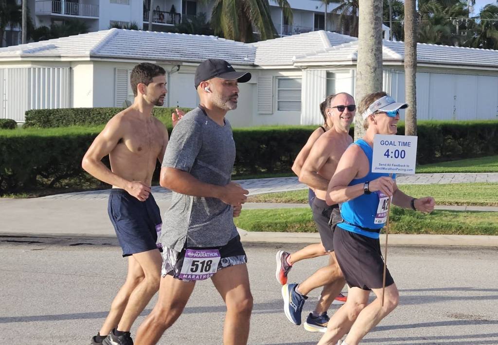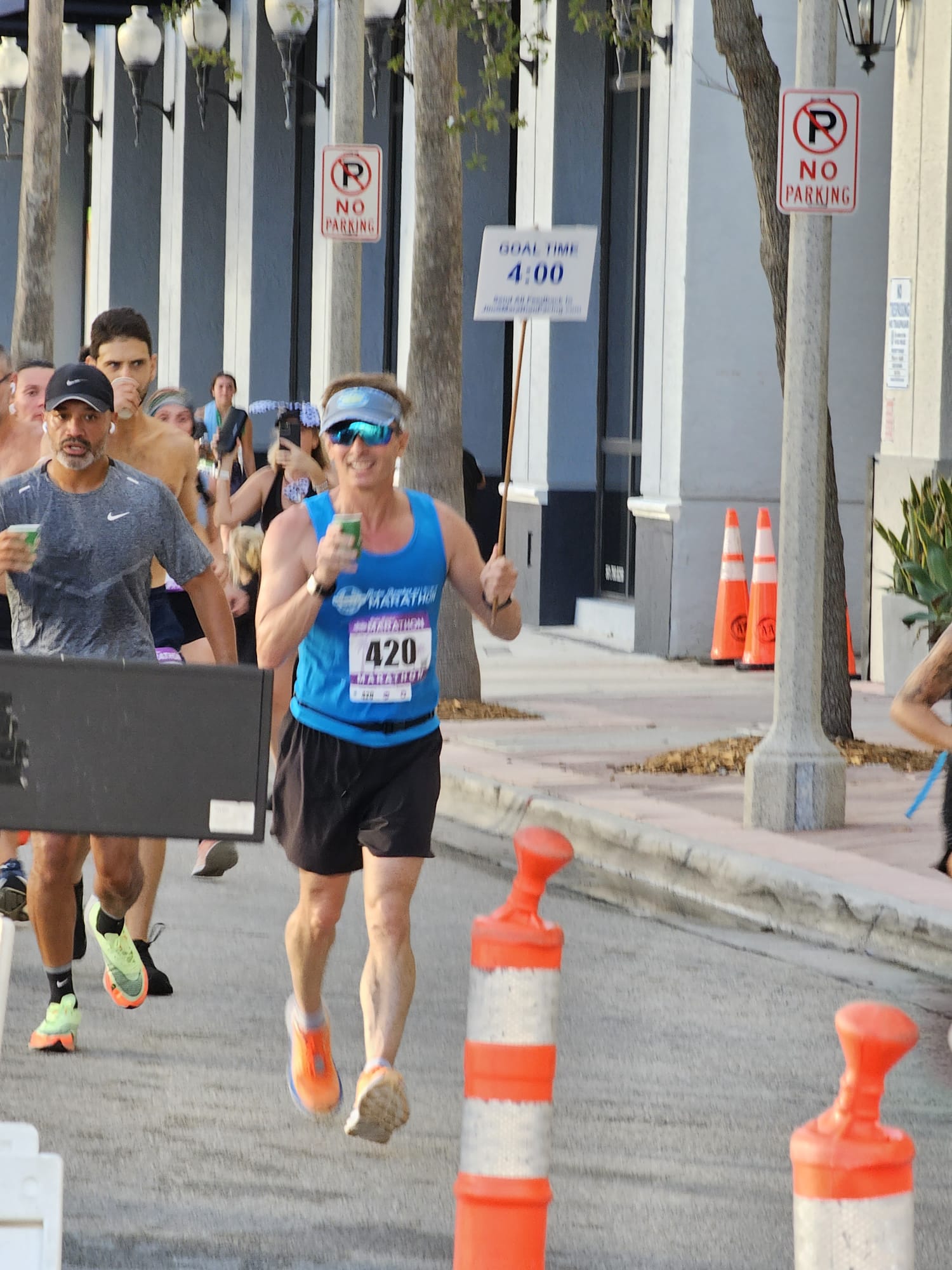 We ran south under the Okeechobee bridge and on the sun-exposed section of Flagler Drive. Winds were over 10 mph in our face which made holding the sign tricky. My group stayed together, a few halfers fell off, but for the full marathoners, my main tribe was set. Valentina from Davie, Chad (who’s son was in the marathon as a first timer), and Alan. We were on pace for the halfers, ducking off Flagler Drive and into the shady and shielded neighborhood by South Olive Ave. A trip down to the turnaround had us greet the other pacers heading adjacent to us and seeing more familiar people. The runners were impressed with how many people cheered for us and knew me. I told them they’d likely get a similar response on their “home course.”