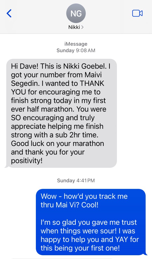 Upon finishing, I went to the PBRR tent. Lying on the grass, I had some calf cramping (Not enough salt pills) but felt good, finishing with a 3:59:39. I recived a text from Nikki, who knew a mutual friend, Mai Vi Segedin. Together they put together that I was the pacer that helped her finish her first half marathon… here’s her text message to me: