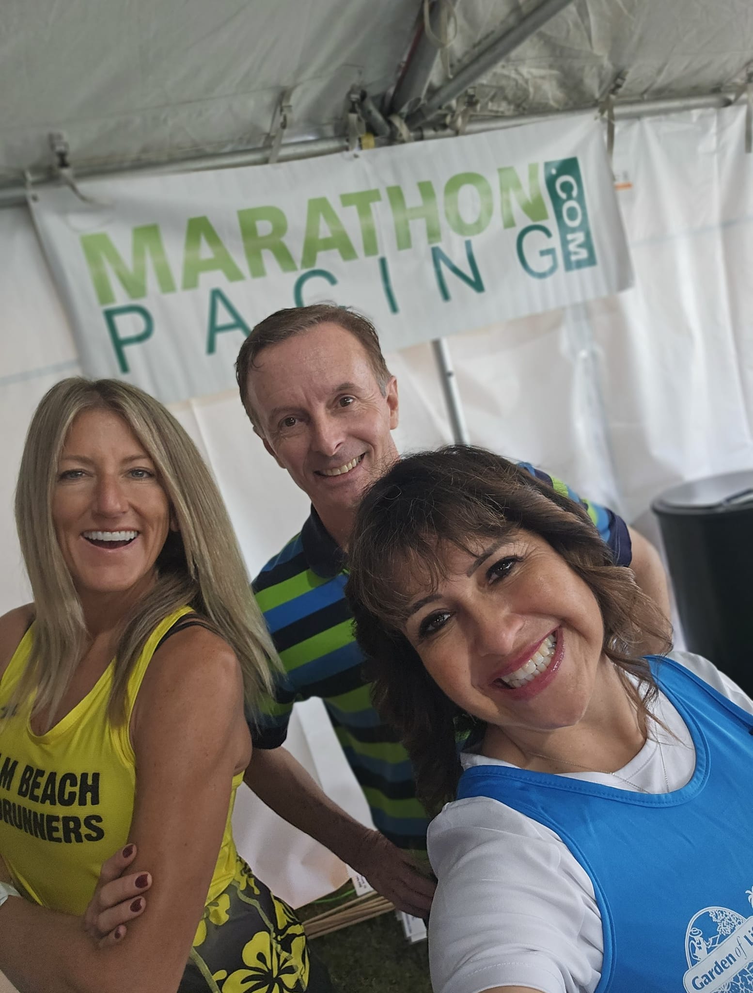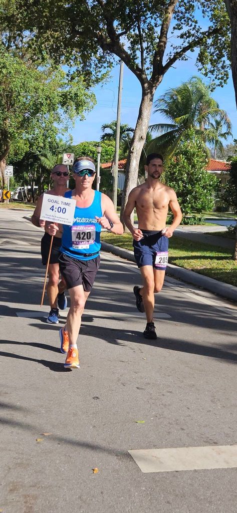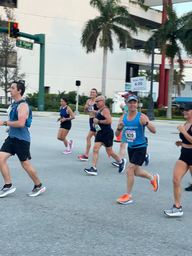 Coming around the Okeechobee Blvd curve, I saw a gal run then slow to a walk in front of us. She wasn’t a part of my group earlier. I tapped her shoulder & told her to run with us, stating it’s easier to be in a group than it is to run solo. She picked up her pace and ran next to me. I handed her the pacer sign & asked her for her name…