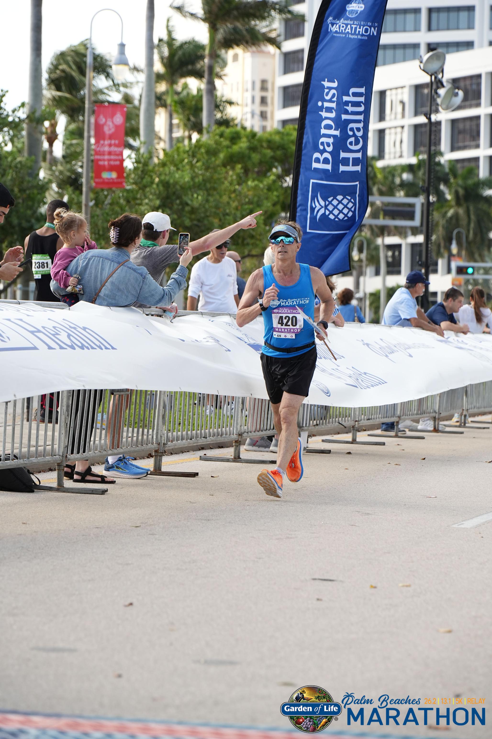 At the Okeechobee Rd intersection, Chad sped up to run it in. I stayed at pace and passed through the relay station at mile 25.7. It’s nice to see friends and get vheers that late in the race. Approaching the Mile 26 sign, I felt the rumbling of stomach discomfort. I guess the Gatorade occasionally alternated with water at the aid stations was catching up with me. I was running solo with Chad now 80-100m ahead. I threw up two mouthfuls of vomit, paused briefly and kept going. Now I was ready to finish. I had been on great pace timing all morning, time to finish this strong.