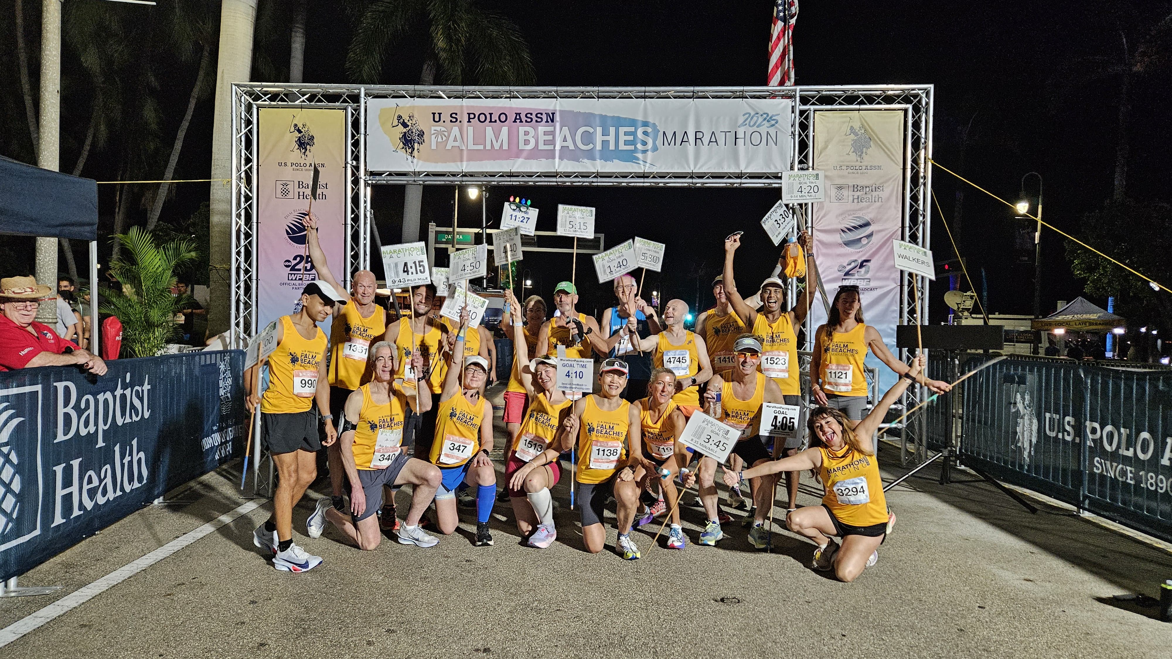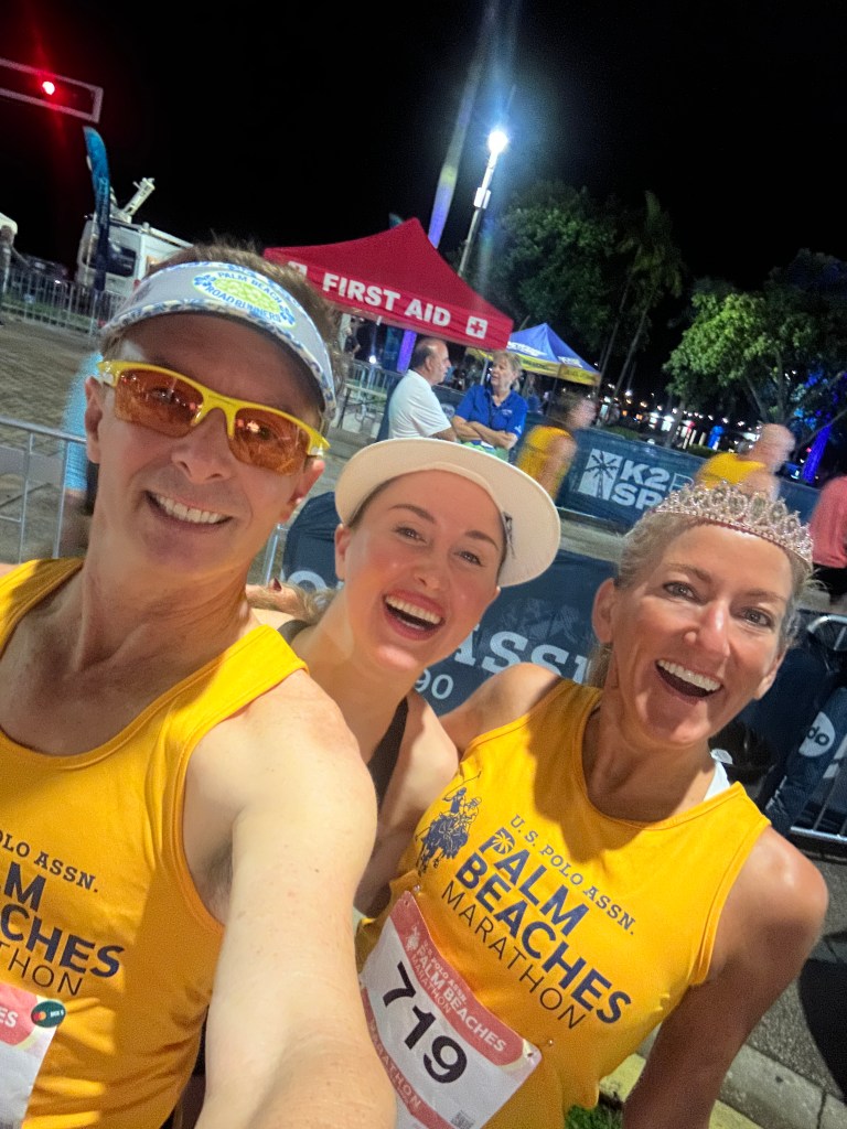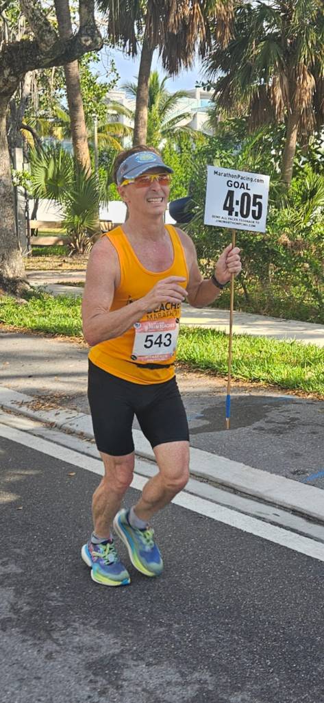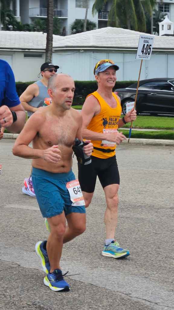 We started and didn’t have too much of an issue getting to the proper 9:20-ish pace in the first mile and a half. My pacer stick came with a pace chart, plus I had one on my belt. Each was created in a very small type font, so I wasn’t too concerned with my splits for the first few miles. I knew at a glance we were doing things well in the dark. I heard the event had over 30% more entrants. There were 2700 half marathoners and 1100 marathon runners. The additional athletes this year meant that once Flagler Drive thinned out on the north side to become a smaller neighborhood road, we really had a thick line of runners using up the width of the road. Atley, Darren and Kimmie were steady and always with me. I chatted a bit about where I knew the street had some rough patches of concrete so that people would watch their step in the dark. Once we got up near the Rybovich Marina, I spoke about the hot new restaurants in town and some of the very large yachts and their owners. It was up here right about at mile 3 where we encountered a water stop that was definitely not ready for us. They didn’t have a lot of volunteers, and many cups were just lying on the table filled for the taking. It was kind of like a “help yourself” hydration station! We continued at the same pace up to the Manatee Lagoon turnaround spot, then we became the parade on the way back down south. I saw the other pace groups and many friends coming at me. Prior to mile 5 it had become lighter out due to the sunrise. I was able to check in with our total time and found we were merely 3 minutes off perfect pacing. I encouraged all of my runners to start using their nutrition when we left manatee lagoon, I took my very first Neversecond gel right around mile five. I reminded my squad to stay ahead of their thirst, taking small water at each station because the cups are only 5 oz and they’re never full ~ so you’re really not getting a lot of hydration whether you choose Gatorade or water.