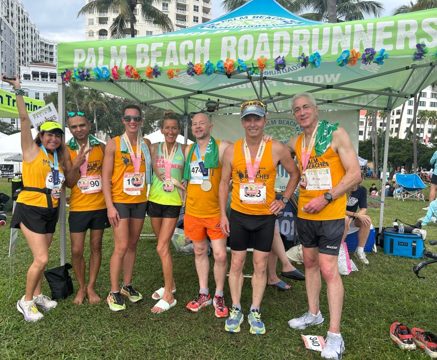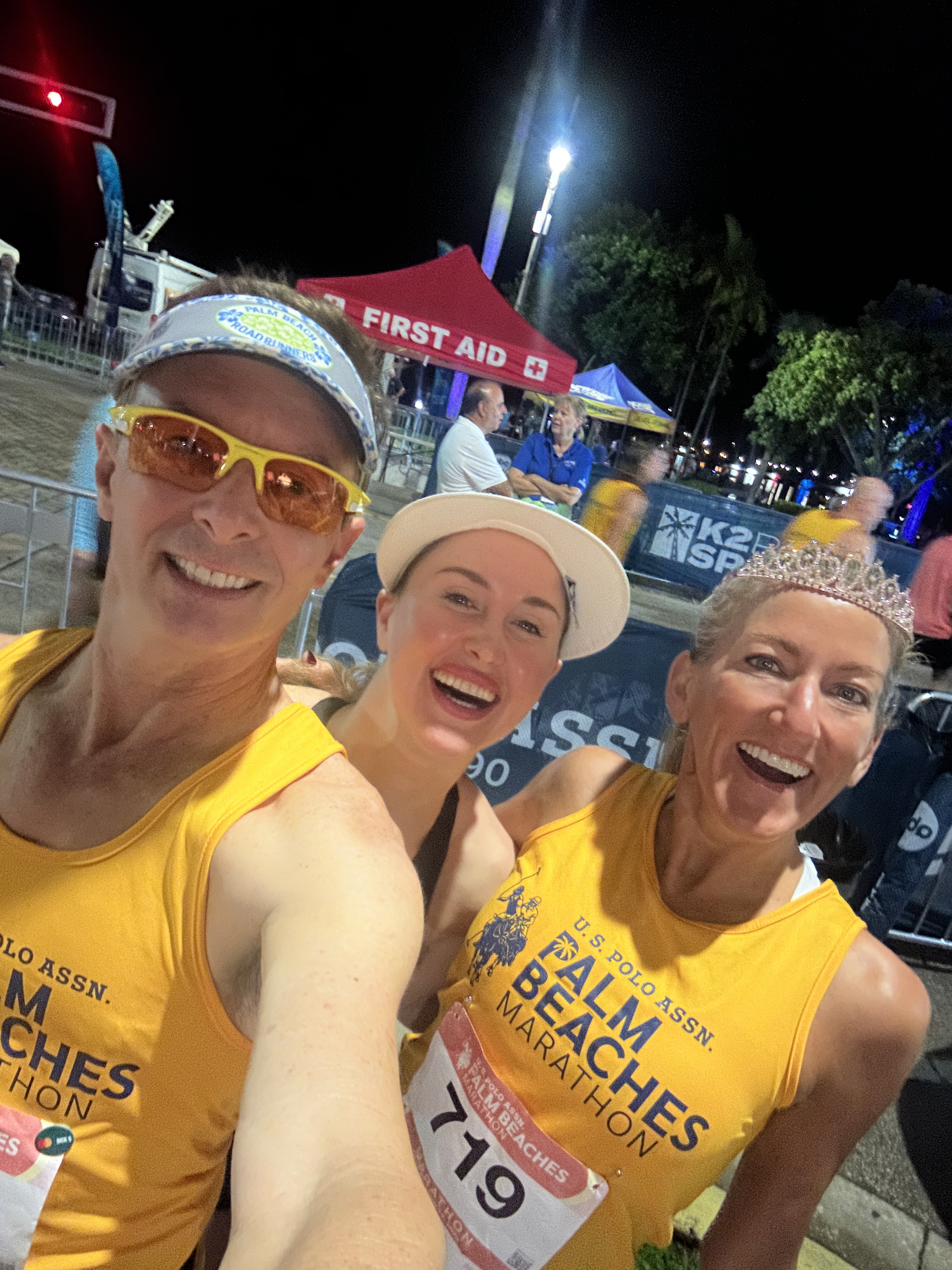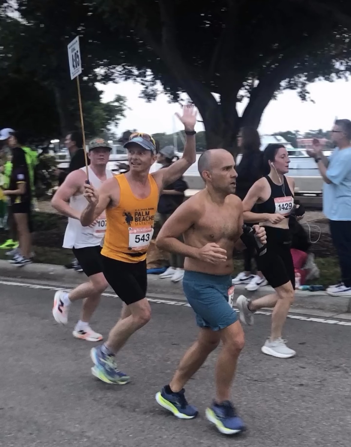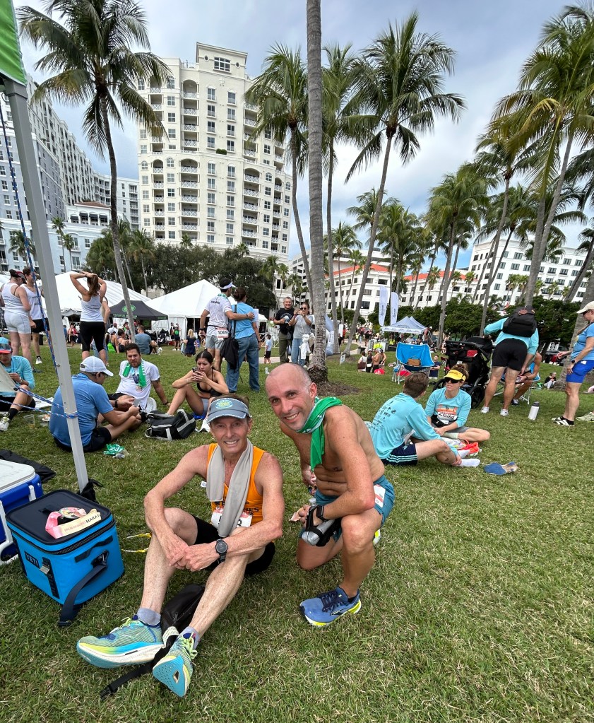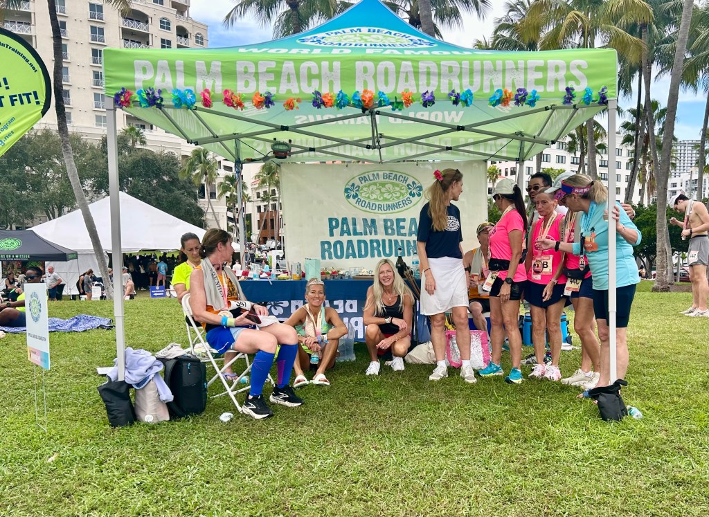 I arrived Sunday at 4:05 am, parked at my office which is 6 blocks from the start/finish line area. I helped with the setup of our club tent on the hill next to the race. Then to the water stop that PBRR was co-hosting with U.S. Polo Assn. the new title sponsor to help get the tents and some of our volunteers in place. We were also responsible for beer sales and receiving tips, that whole area thankfully was setup Saturday afternoon. I took a short jog with maureen and Kerry down to the Truist bank on Flagler Drive and back in hopes that this would stir up any need to visit the restroom. All this had to happen BEFORE we took our team photo and got in the corral. I had a water bottle with me to start and no concerns about fitness or nutrition prior to the launch.