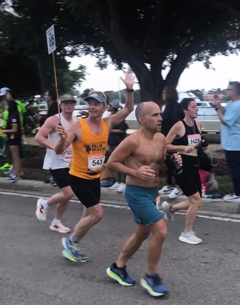 At this point the south section of Flagler drive was not in the sun. We glided through those 2 1/2 miles staying within 5 or 6 seconds of ideal pacing. I was now picking up a few people who could not stay with Prasantha’s two hour group. I encourage them to run with me and when they got to the Family Church steeple, they could dash in for their final 3/4 of a mile. Some of the half marathoners were very grateful for the assistance and I kept reminding anyone with the red colored bib number that we would be favoring the left side of the road to go around the back of the stage area while the half marathoners went on to their finish. I saw Kimmie had fallen back maybe 100 meters but gave me a wave as she ran towards the finish line. My marathoner group went into the shade on Narcissus Ave to begin lap #2.