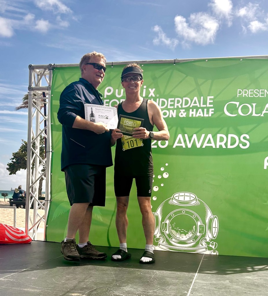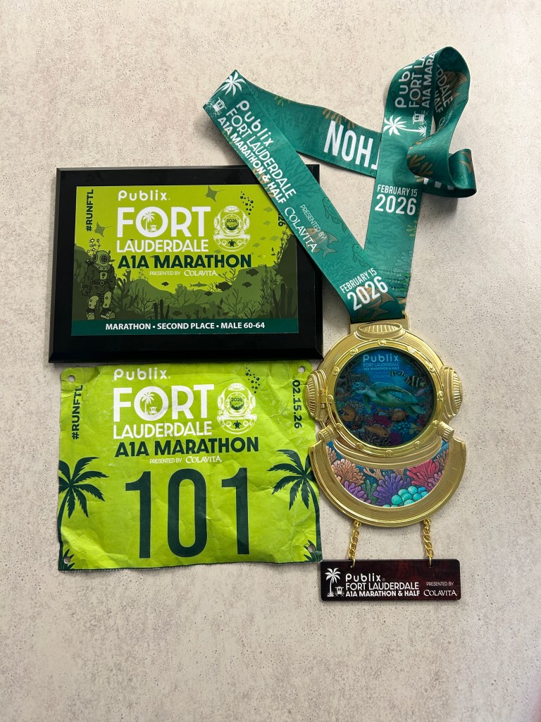 Another A1A race done with a prize for 2nd place in my age group – catching first place wasn’t close – he finished in 3:11.