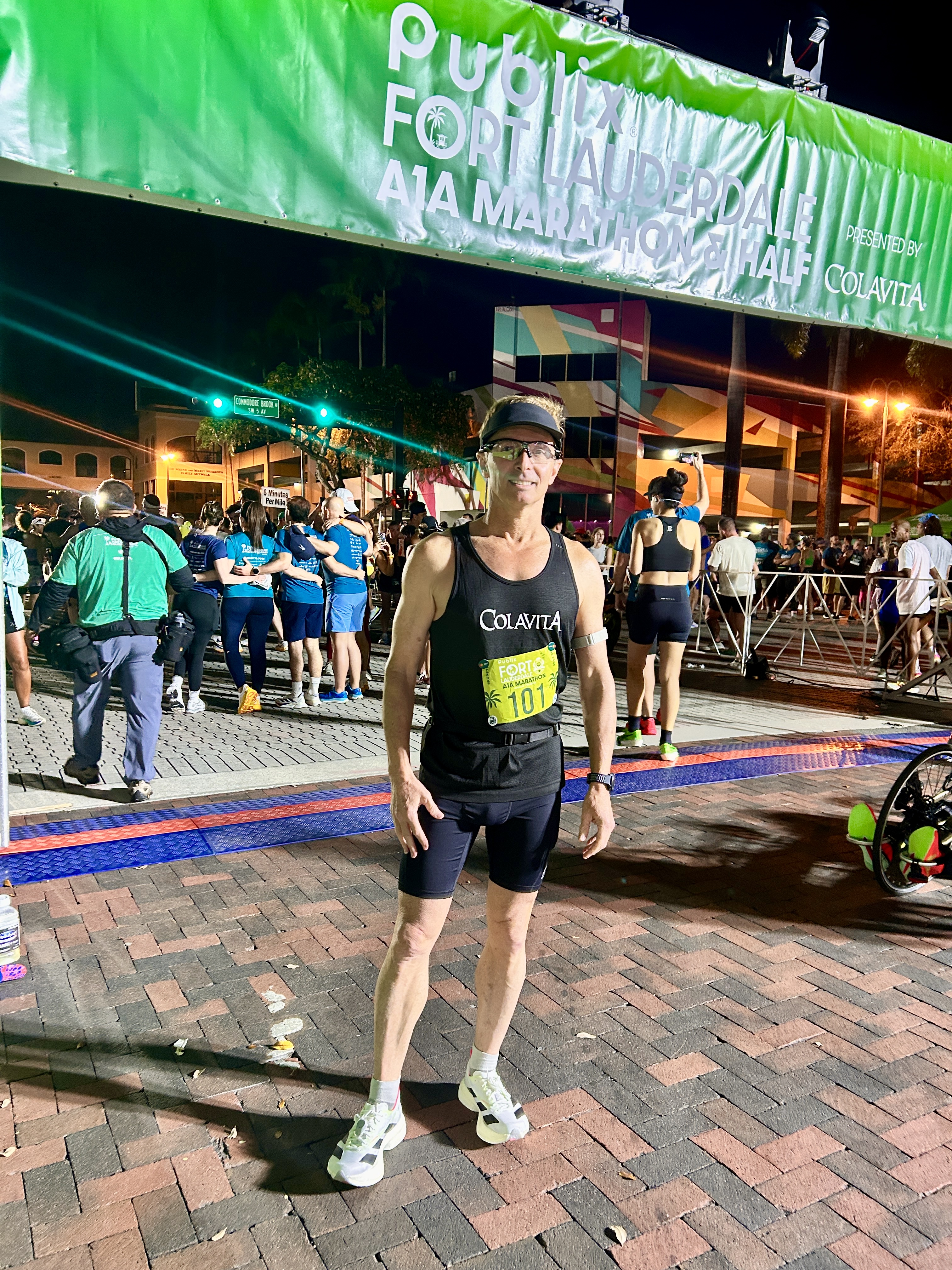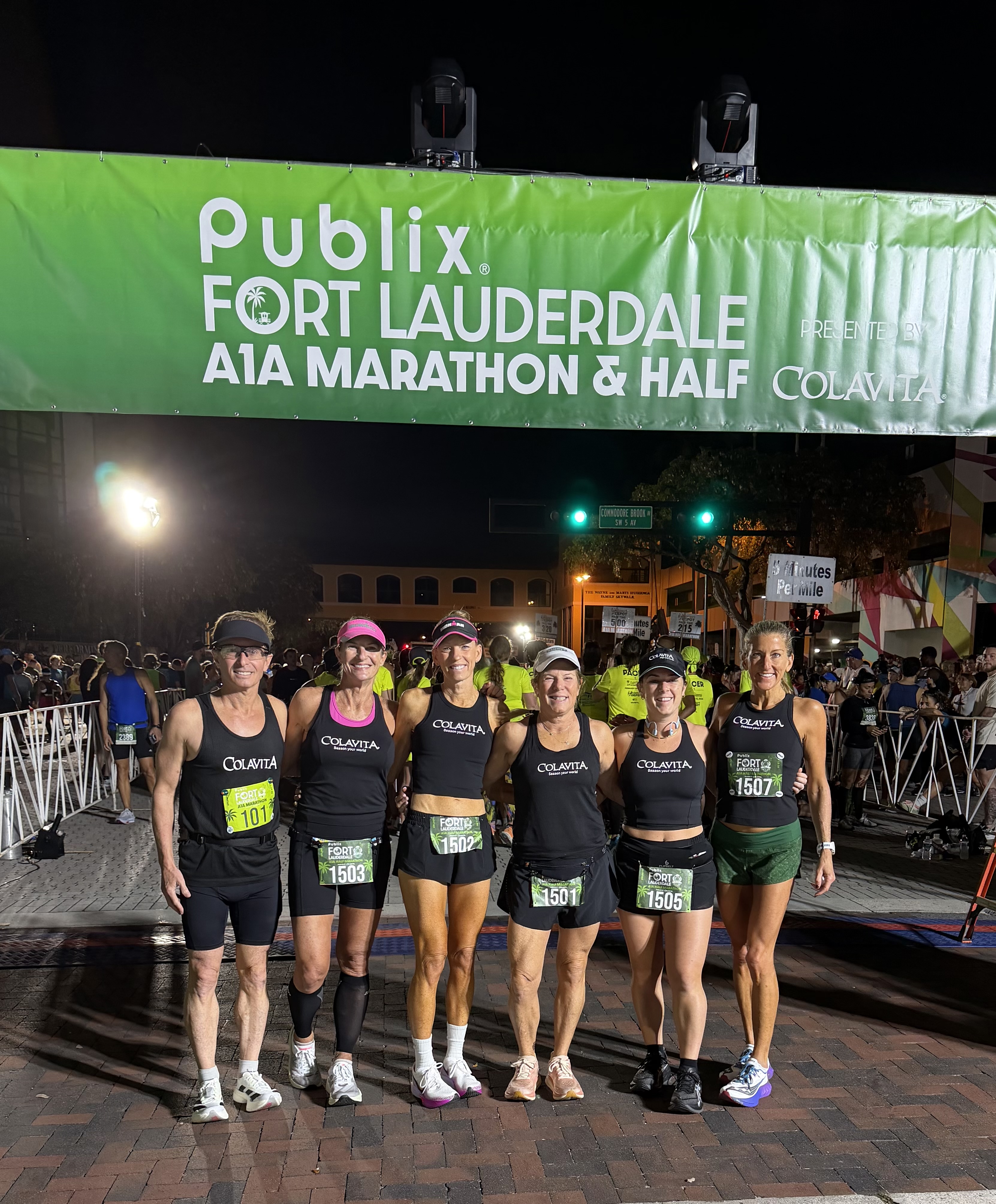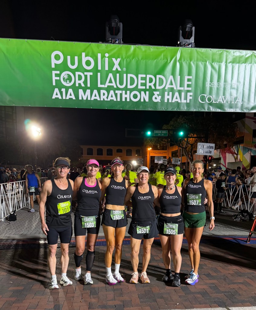 I waited at the Start line and this year we all made it on time for a Colavita Team photo. That was good. I looked for Kerry, Justina and Maura at the start line. Maura was borrowing a visor, so I didn’t want to miss her and have to carry or engineer what to do with a second one. I wore a new lululemon visor, a vented black Colavita singlet, Flip Belt stretch shorts, and a leather pouch belt. I took a Maurten Caffeine gel at the start before the race began. There were 5500 starters with 1000 in the marathon and 4500 in the half. I had several SIS Beta Nootropic gels, a Maurten regular gel and salt pills in the pouch.