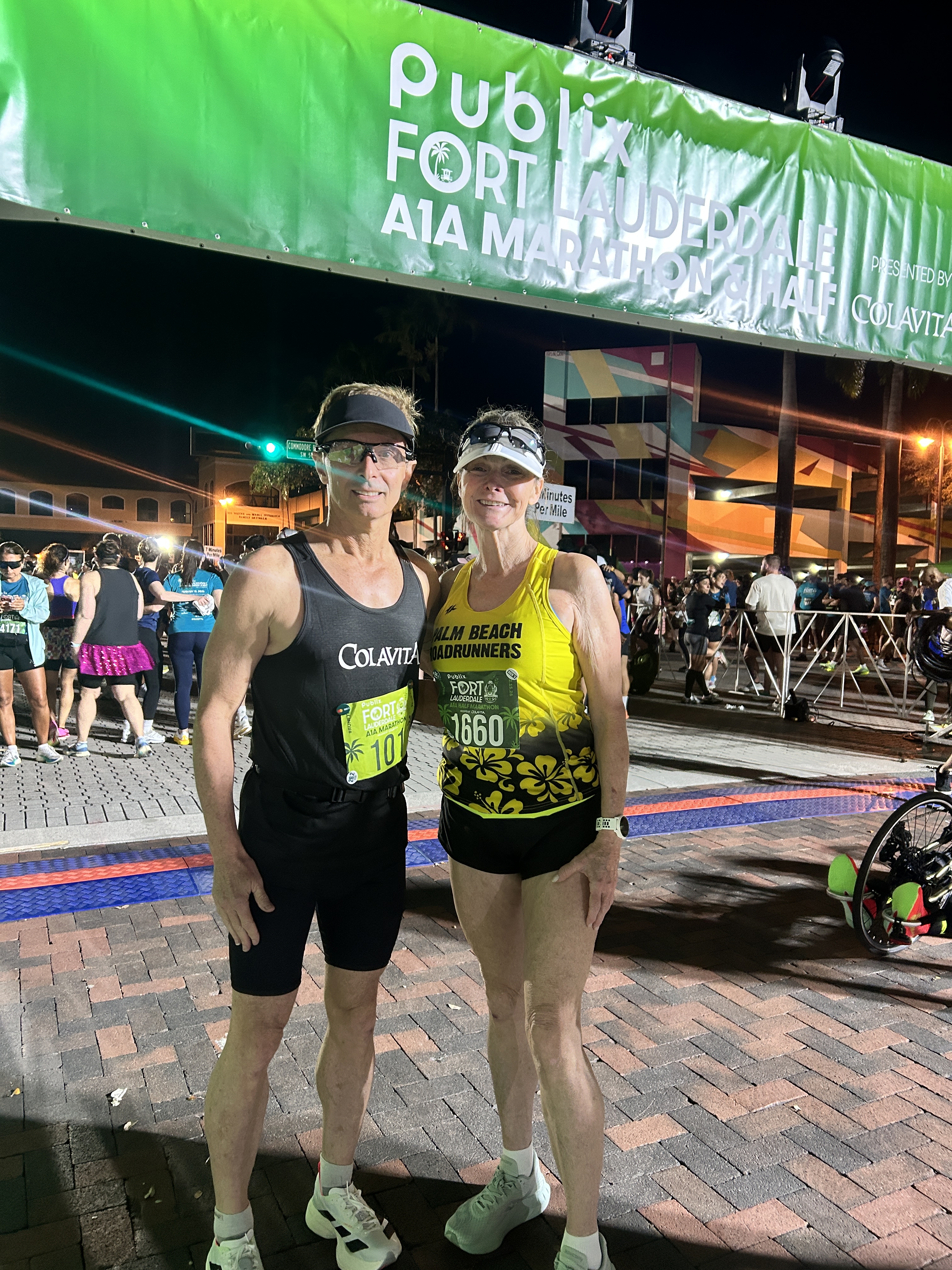 Race morning saw Walter meet at my house at 3:00 am and Maureen come to pick us up at 3:15 am for the drive to the finish line. We avoided a blown out tire accident that happened right before us at the Woolbright Rd exit. Right behind us we saw police cars and emergency lights – that would have been a delay on top of the 1 hour drive south. We drove down Sunrise Blvd to A1A and down to the Bahia Mar VIP parking. It was very windy and 71 degrees, everything was affected by the string southerly wind. I could have had a throw away long sleeve shirt for this one, it felt cold even as the temps were warm. We made it to the shuttle bus and it departed quickly after our boarding. The bus driver went at a normal speed (last year she was SLOW) but she didn’t know where the drop off was. She wandered past Broward Blvd, made a few turns and lined up behind all of the traffic looking to park near the Start line. Walter, Maureen and I got off in traffic and walked the rest of the way, beating the bus that slowly crept ahead in traffic.